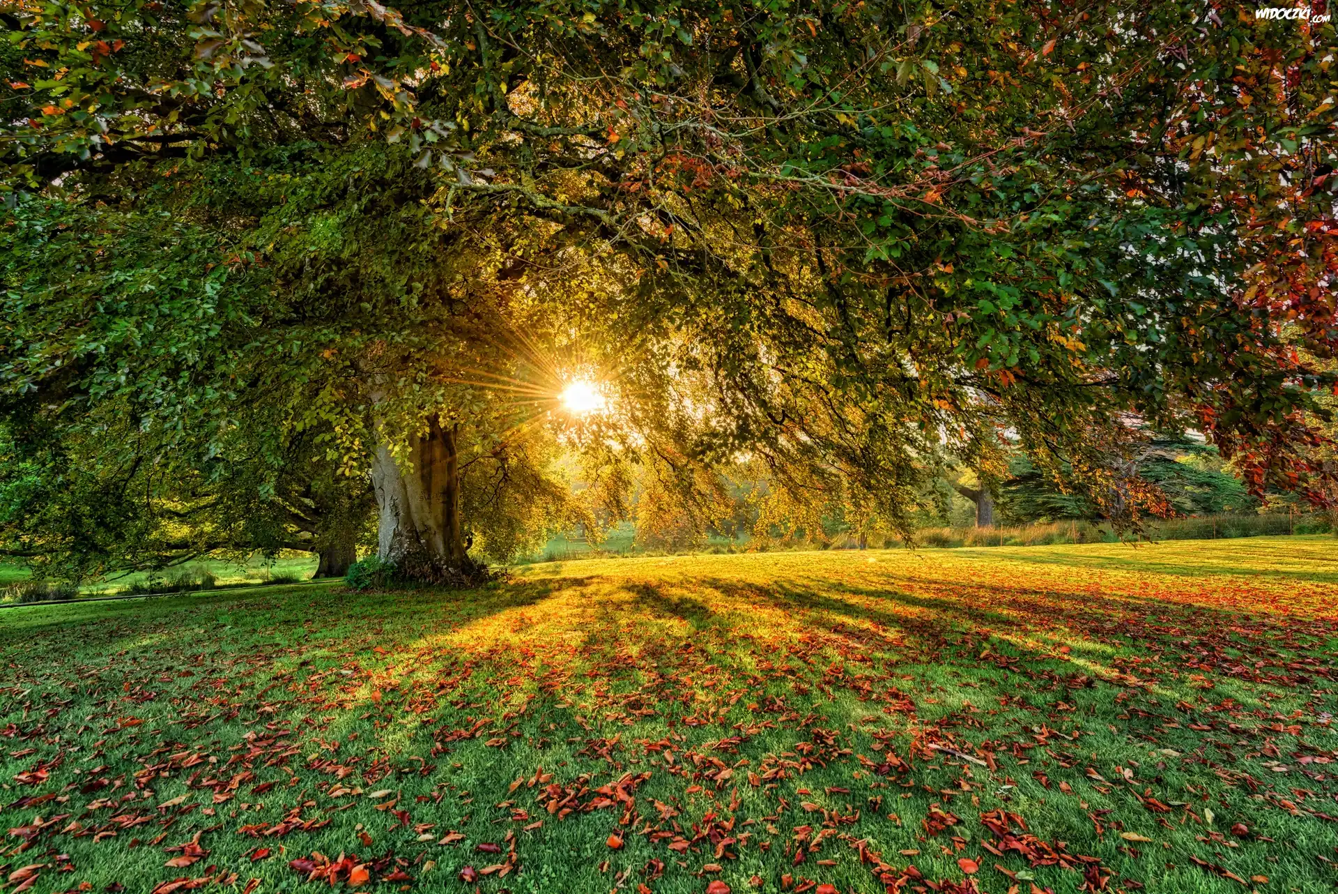 Irlandia Północna, Hrabstwo Tyrone, Dungannon, Parkanaur Forest Park, Drzewa, Promienie słońca, Liście, Jesień |