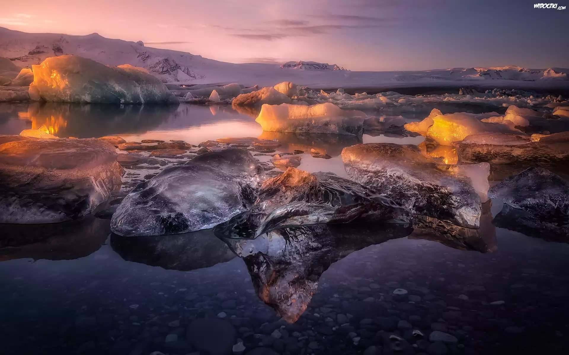 Zdjęcia, Islandia, Zima, Jezioro, Bryły, Lód, Wzgórza