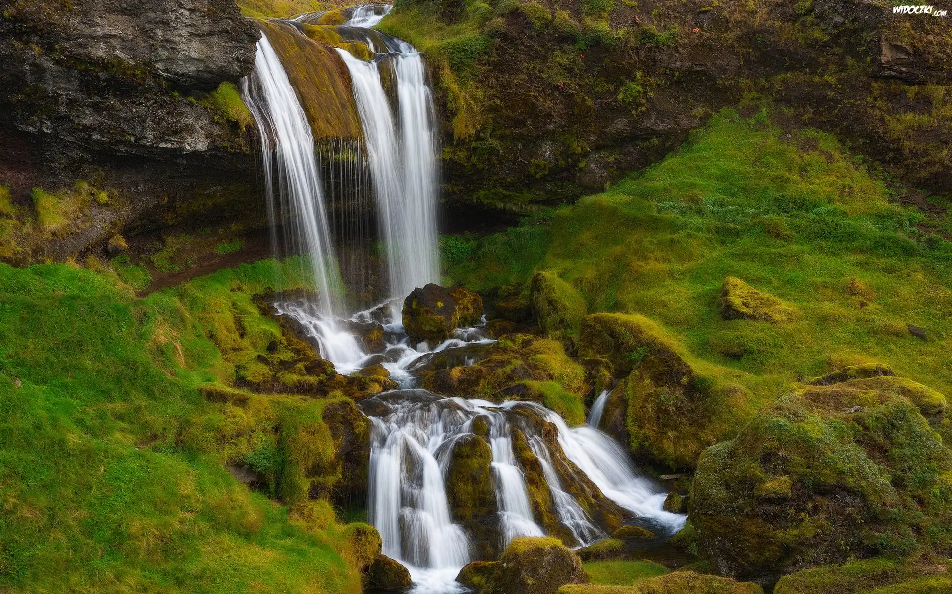 Zdjęcia, Islandia, Wodospad Selvallafoss, Skały, Omszałe, Kamienie