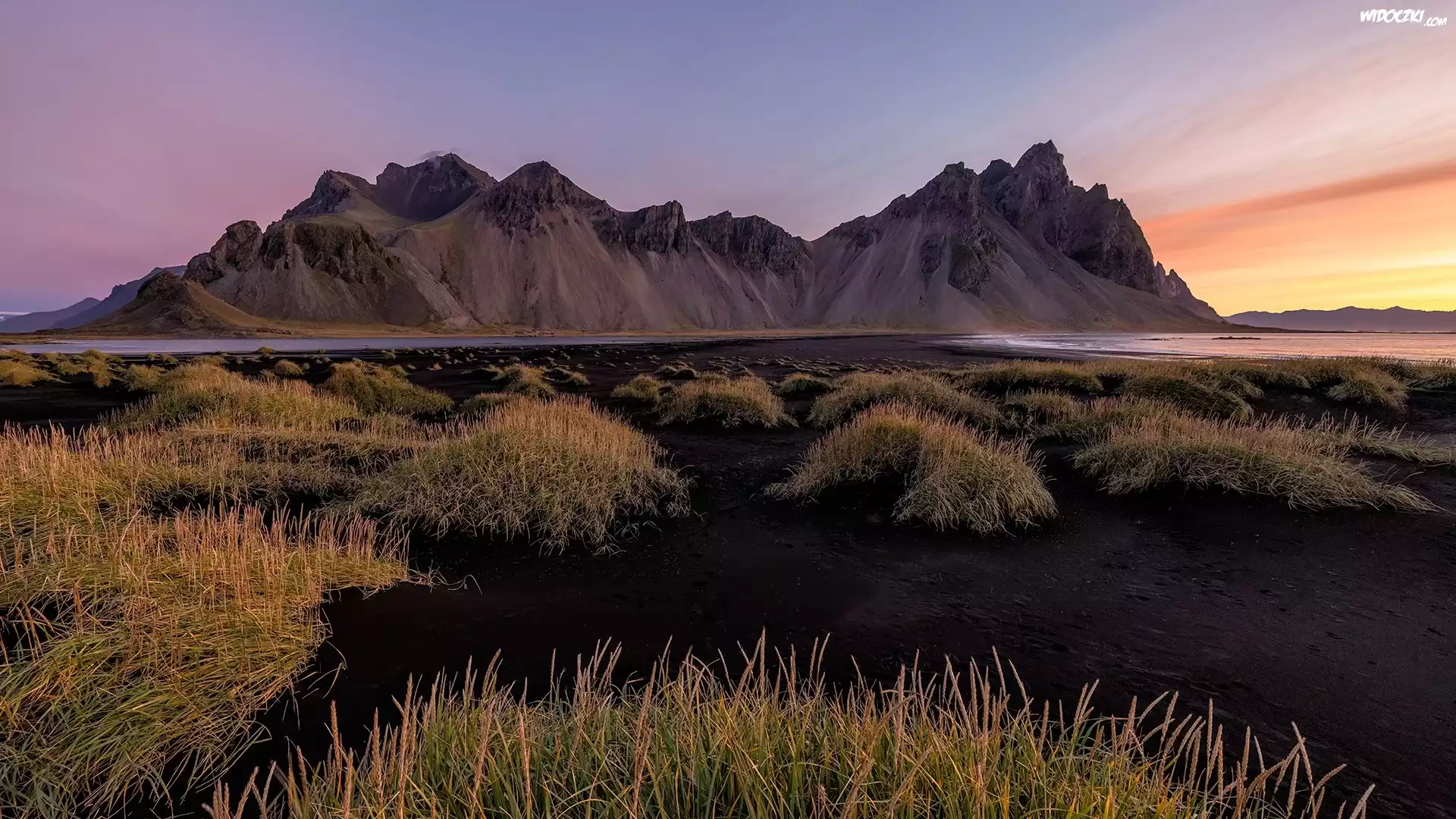 Zdjęcia, Islandia, Góry, Góra Vestrahorn, Plaża, Czarny, Piasek, Trawa, Kępki