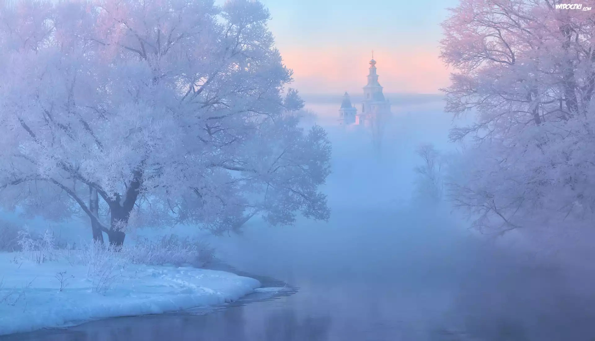 Klasztor Zmartwychwstania Pańskiego, Zima, Rzeka Istra, Mgła, Drzewa, Istra, Obwód moskiewski, Rosja |
