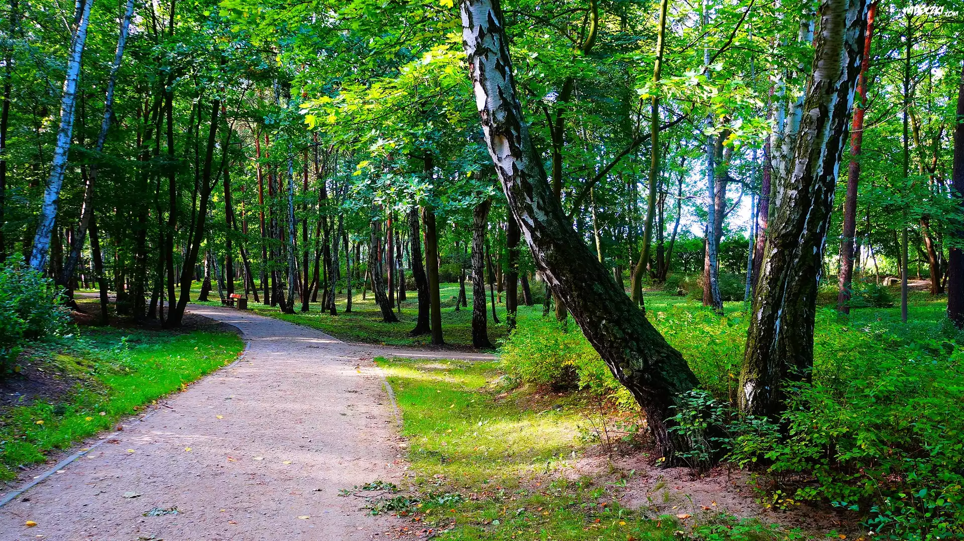 Zdjęcia, Polska, Gdańsk, Park Brzeźnieński im.J.J.Haffnera, Alejka, Drzewa, Brzozy, Zieleń