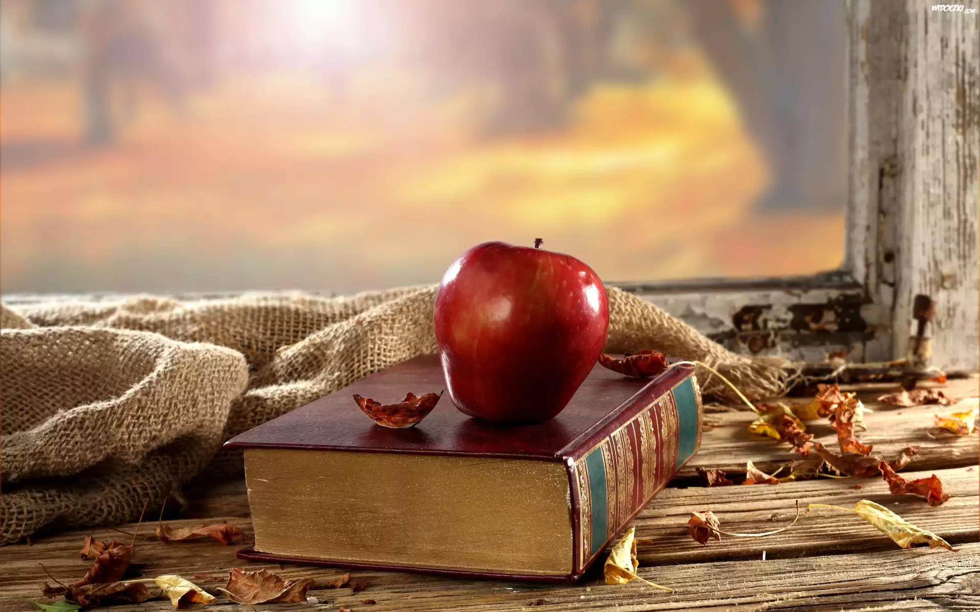Jabłko, Książka, Jesienne, Liście, Okno, Kompozycja