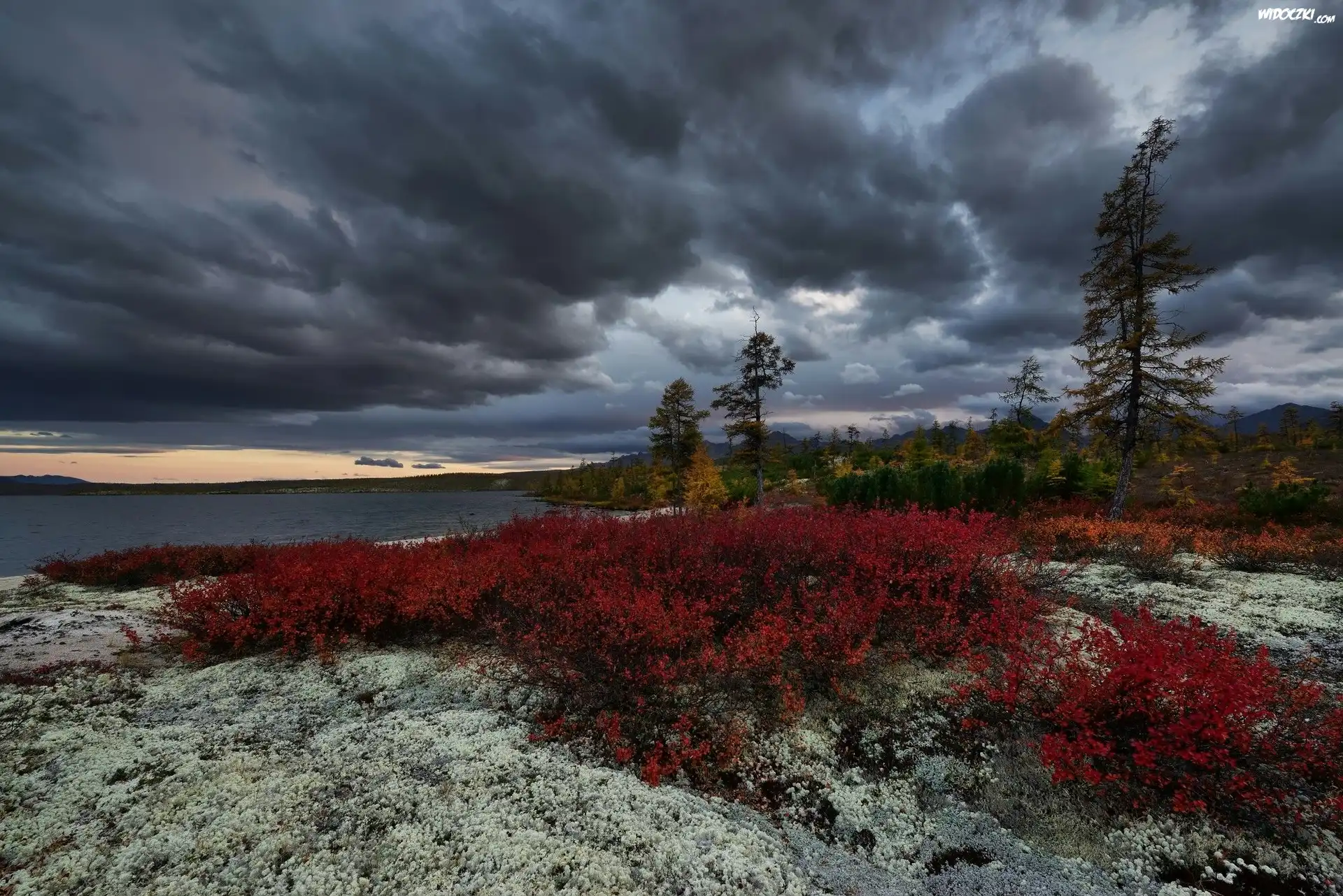 Jesień, Ciemne, Chmury, Jezioro Jack London, Drzewa, Kolorowe, Krzewy, Rośliny, Kołyma, Obwód magadański, Rosja |