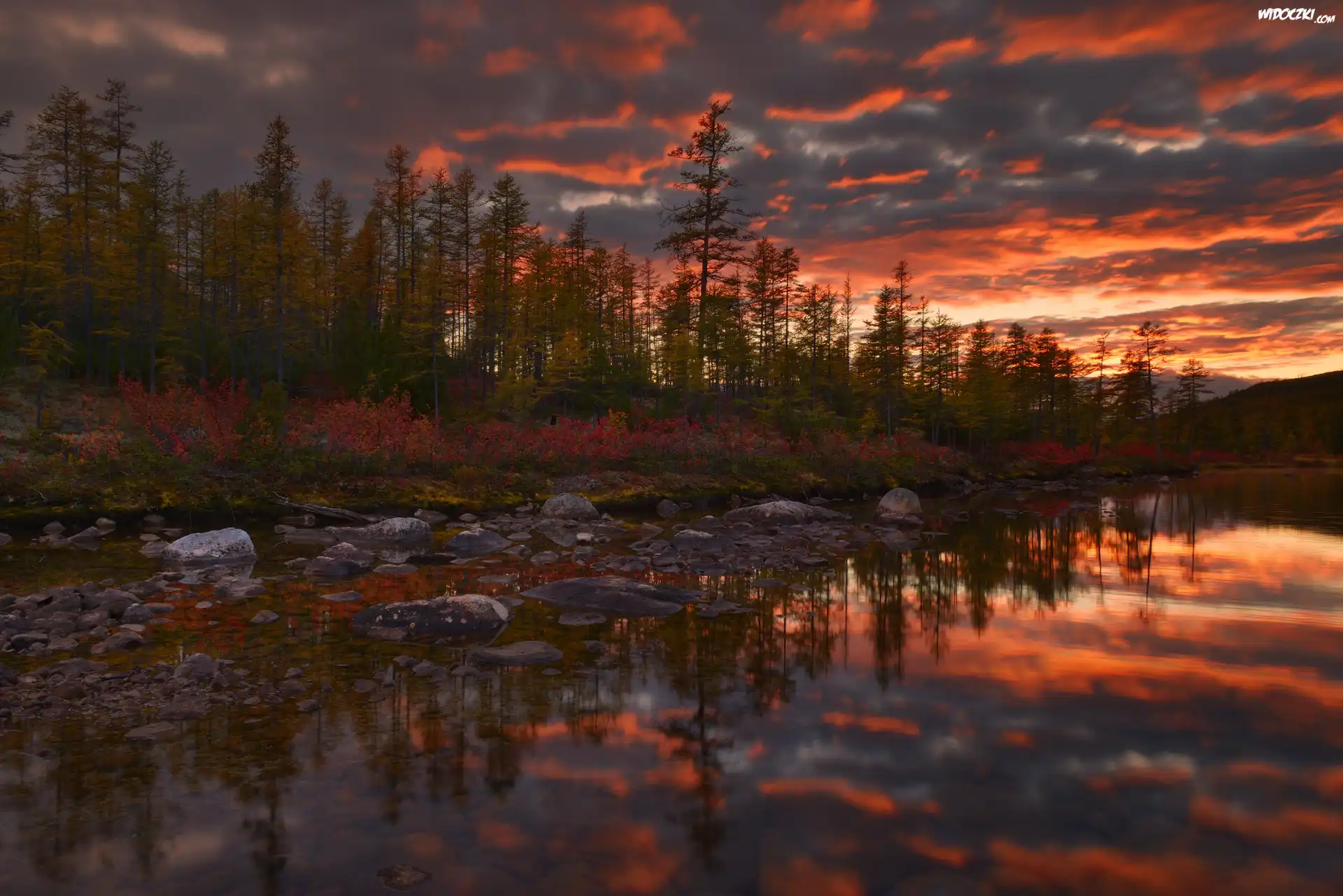 Jesień, Jezioro Jack London, Rosja, Kołyma, Niebo, Zachód Słońca, Kamienie, Drzewa