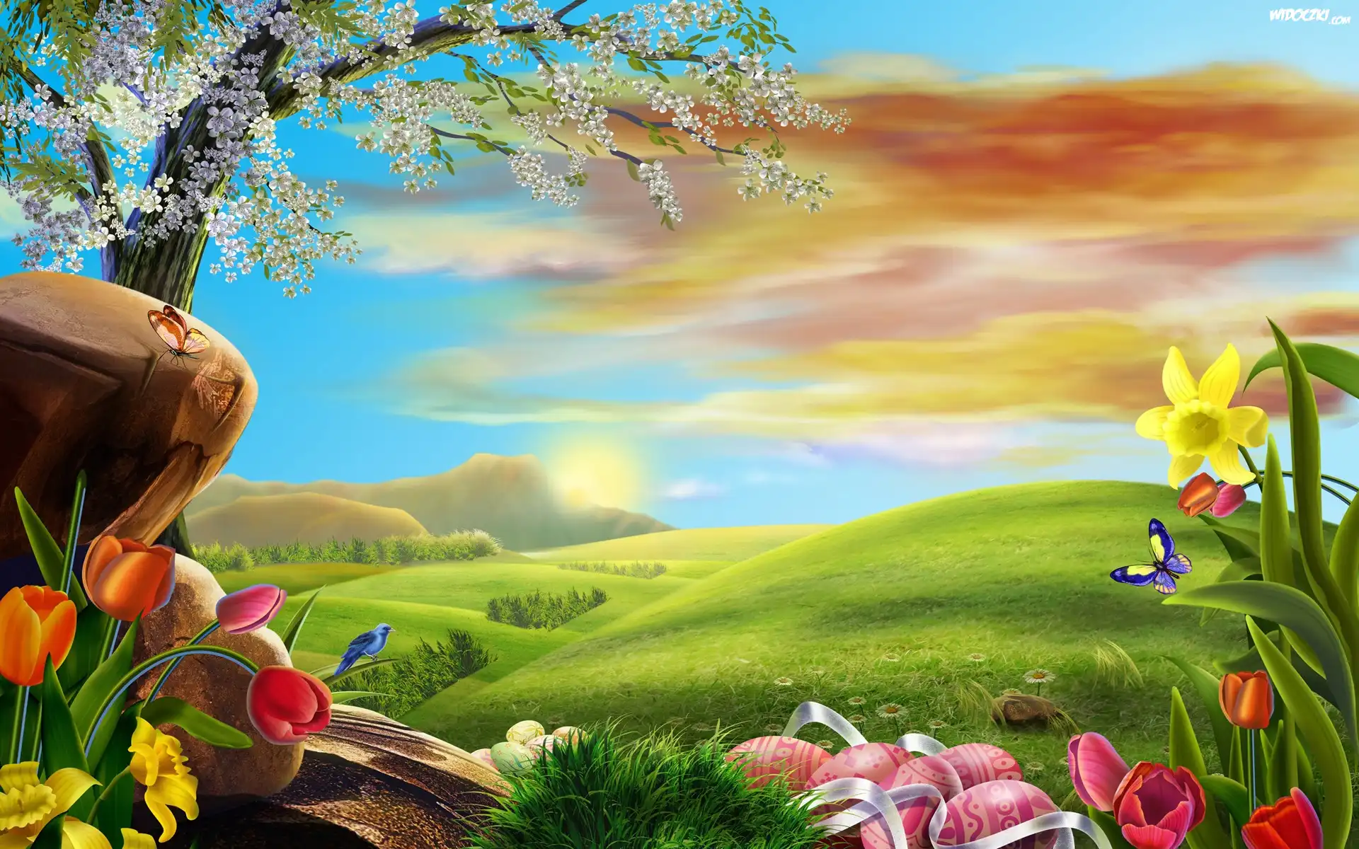 Zdjęcia, Łąka, Kwiaty, Motyle, Jajka, Drzewo