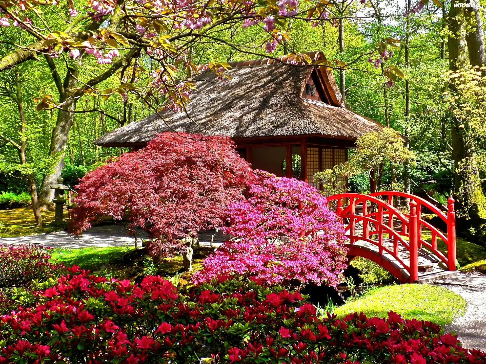 Japoński, Ogród, Mostek, Altana, Kwiaty