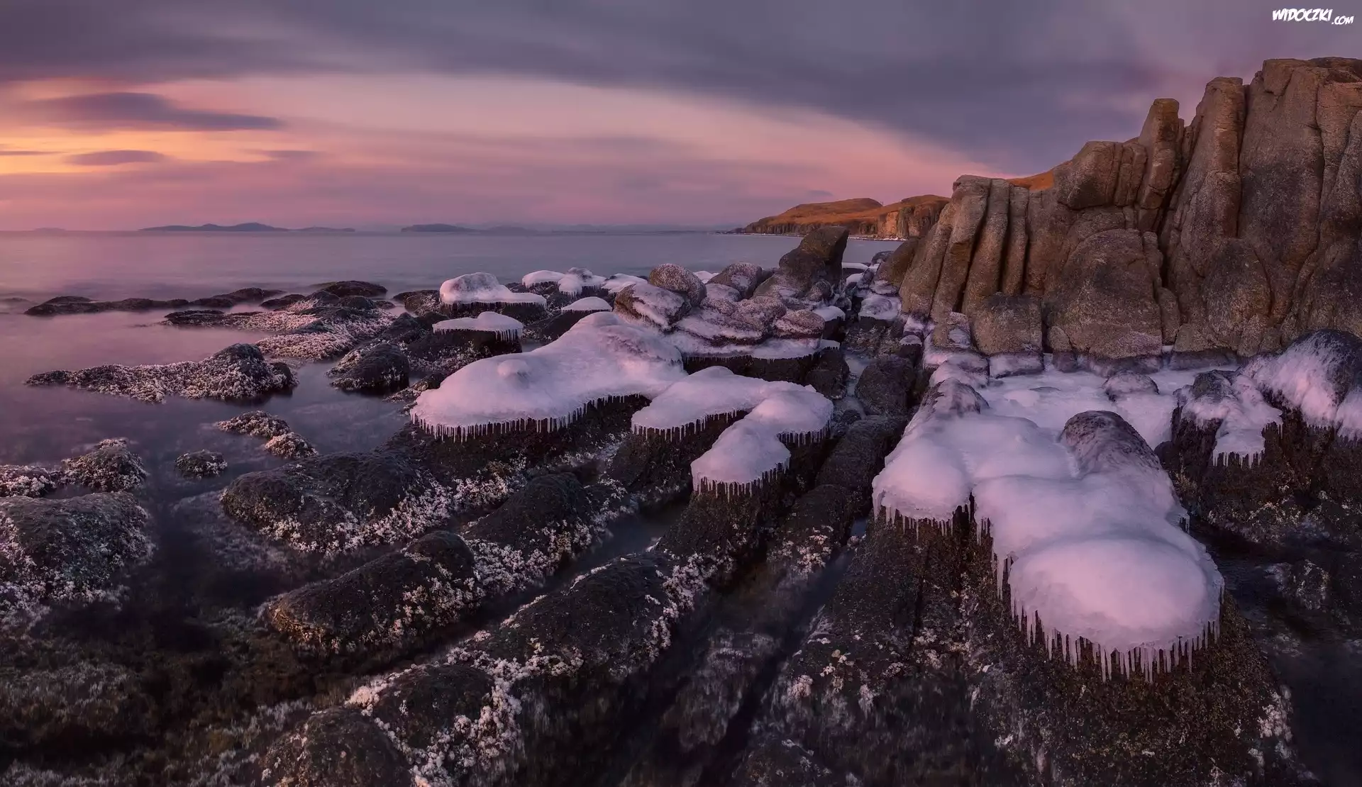 Morze Japońskie, Skały, Góry, Śnieg, Wschód Słońca, Rosja
