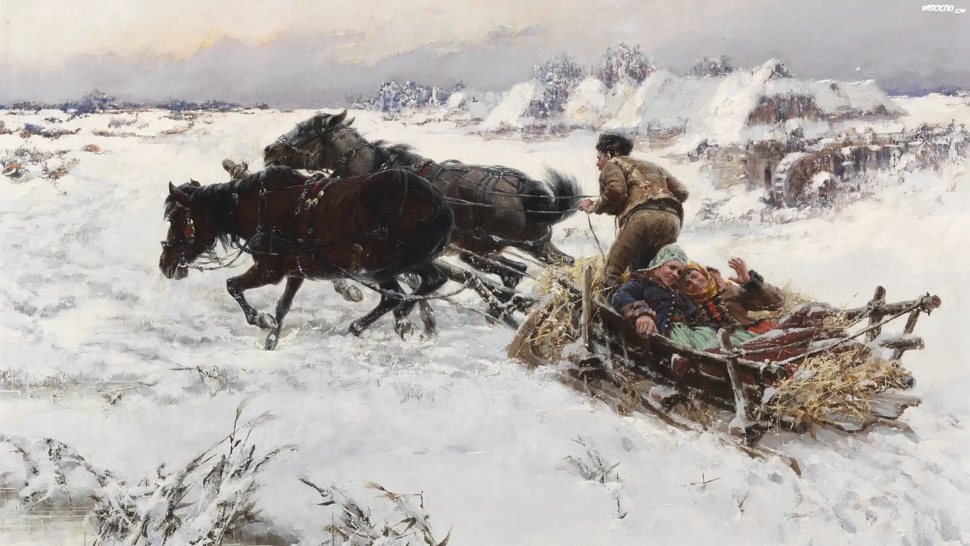 Zdjęcia, Malarstwo, Obraz, Jarosław Weszin, Jaroslav Vesin, Zima, Sanie, Ludzie, Konie, Domy