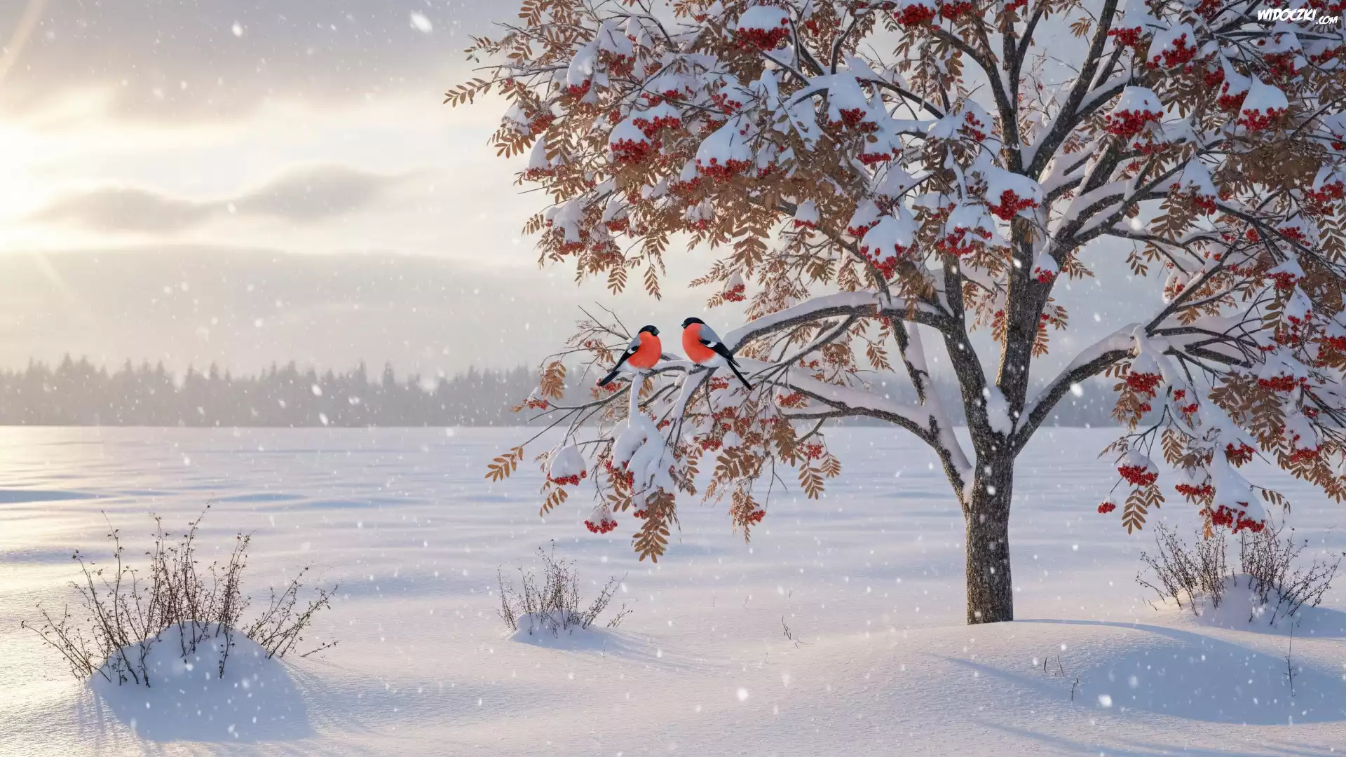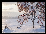 Zima, Jarzębina, Ptaki, Gile, Pole