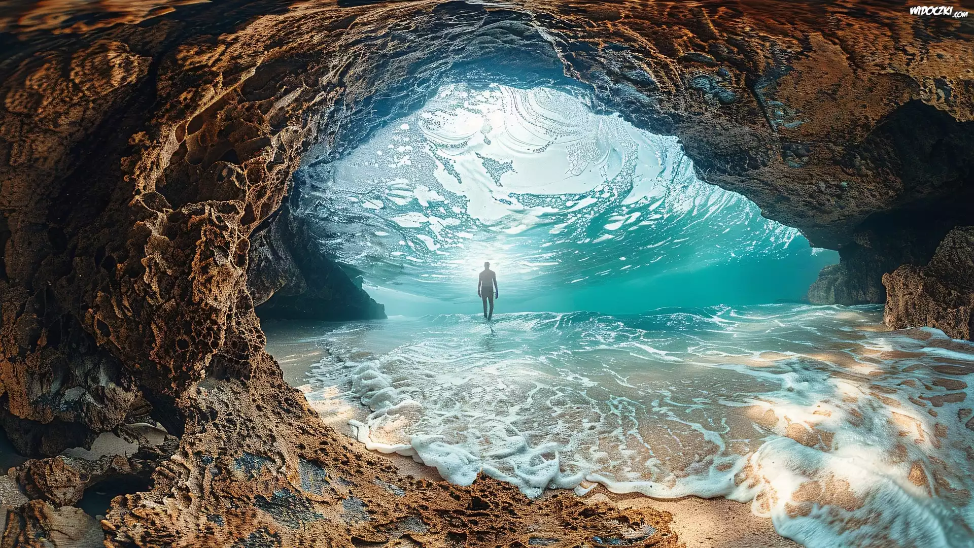 Fotomontaż, Morze, Fala, Jaskinia, Skała, Człowiek