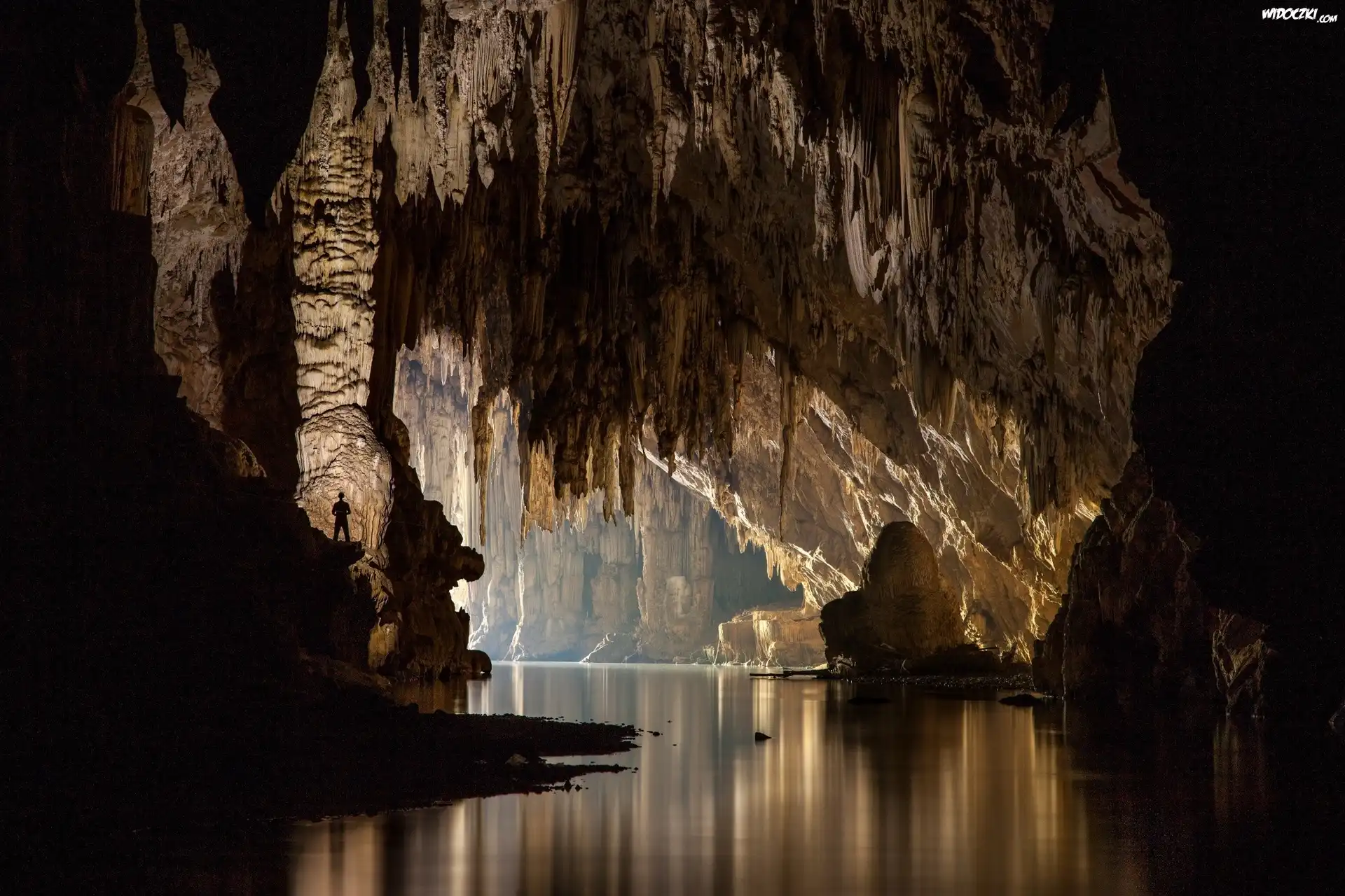 Zdjęcia, Jaskinia, Stalaktyty, Podziemne, Jezioro, Człowiek, Światło