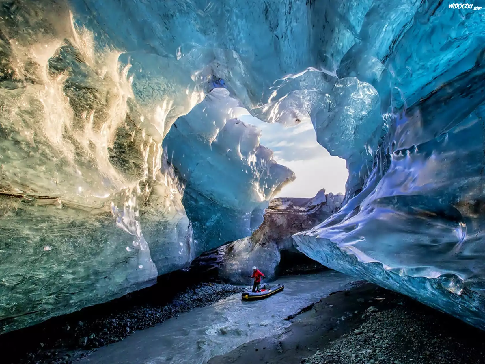 Jaskinia, Lodowa, Strumień, Mężczyzna, Ponton