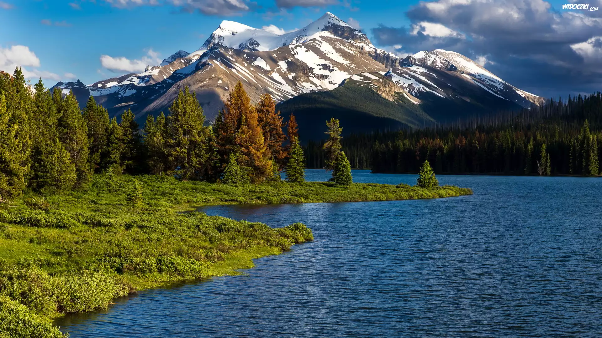 Zdjęcia, Park Narodowy Jasper, Góry, Jezioro, Maligne Lake, Drzewa, Prowincja Alberta, Kanada