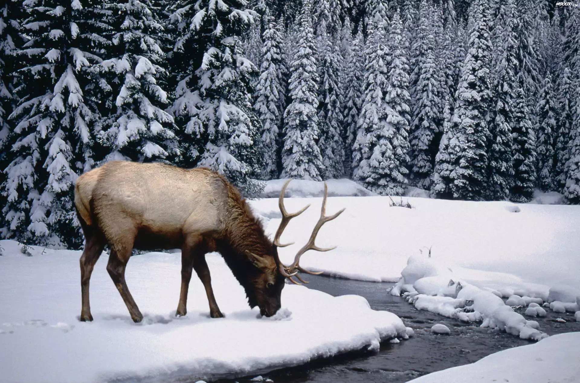 Zdjęcia, Jeleń, Las, Rzeczka, Zima