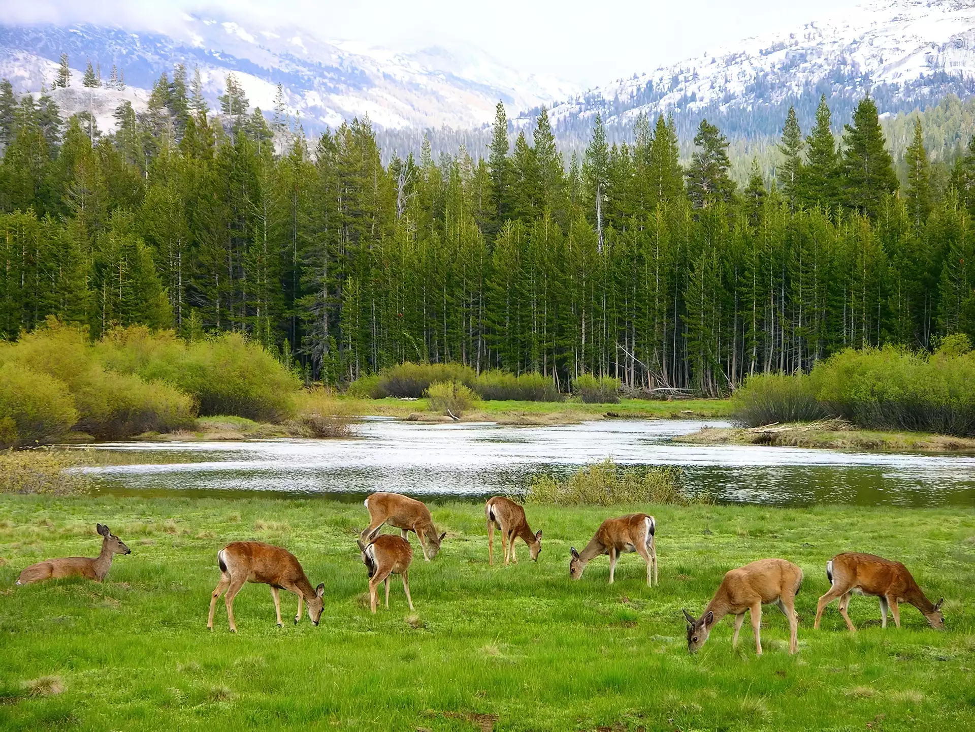 Zdjęcia, Jelenie, Łąka, Rzeka, Las