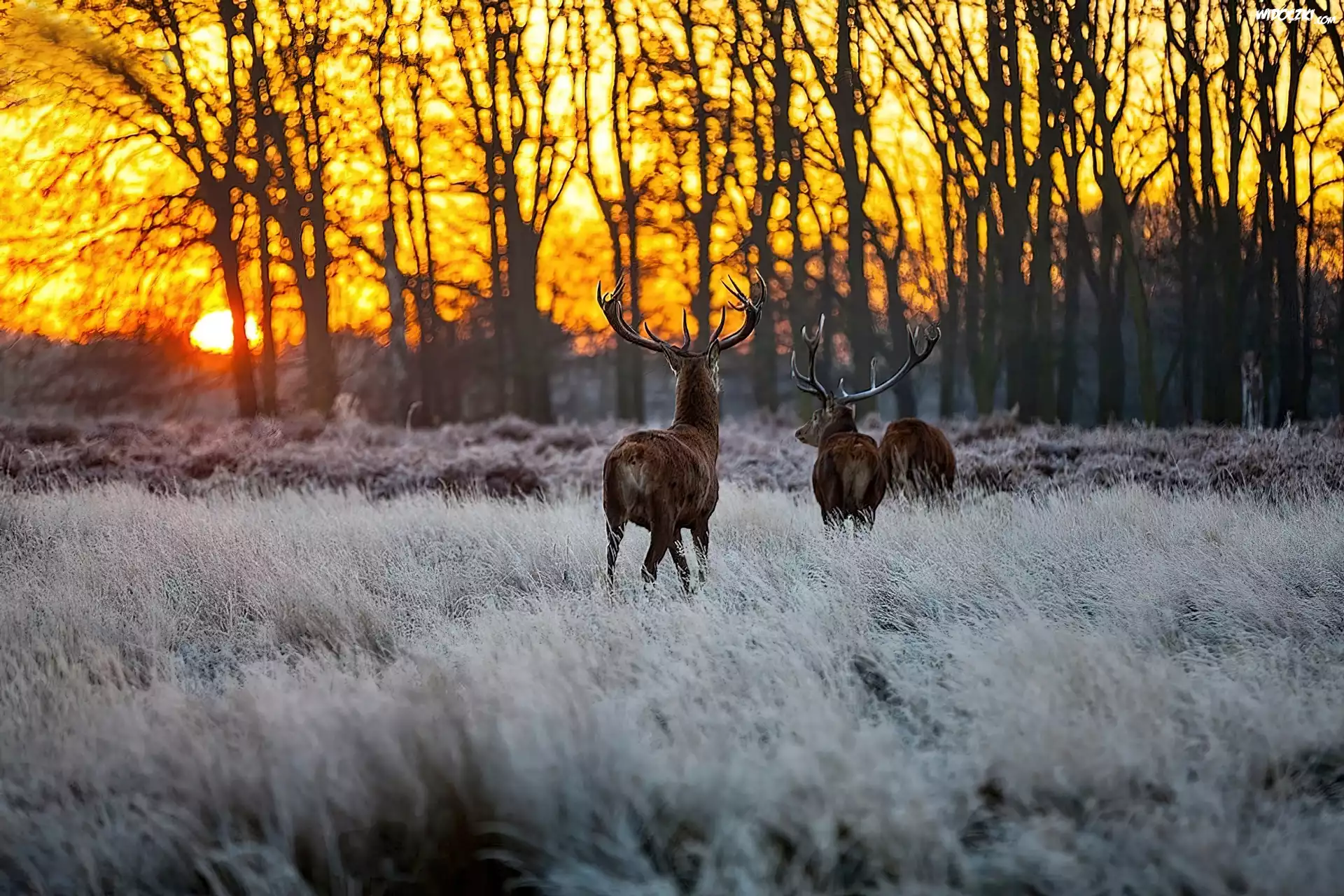 Zdjęcia, Jelenie, Las, Łąka, Zachód, Słońca