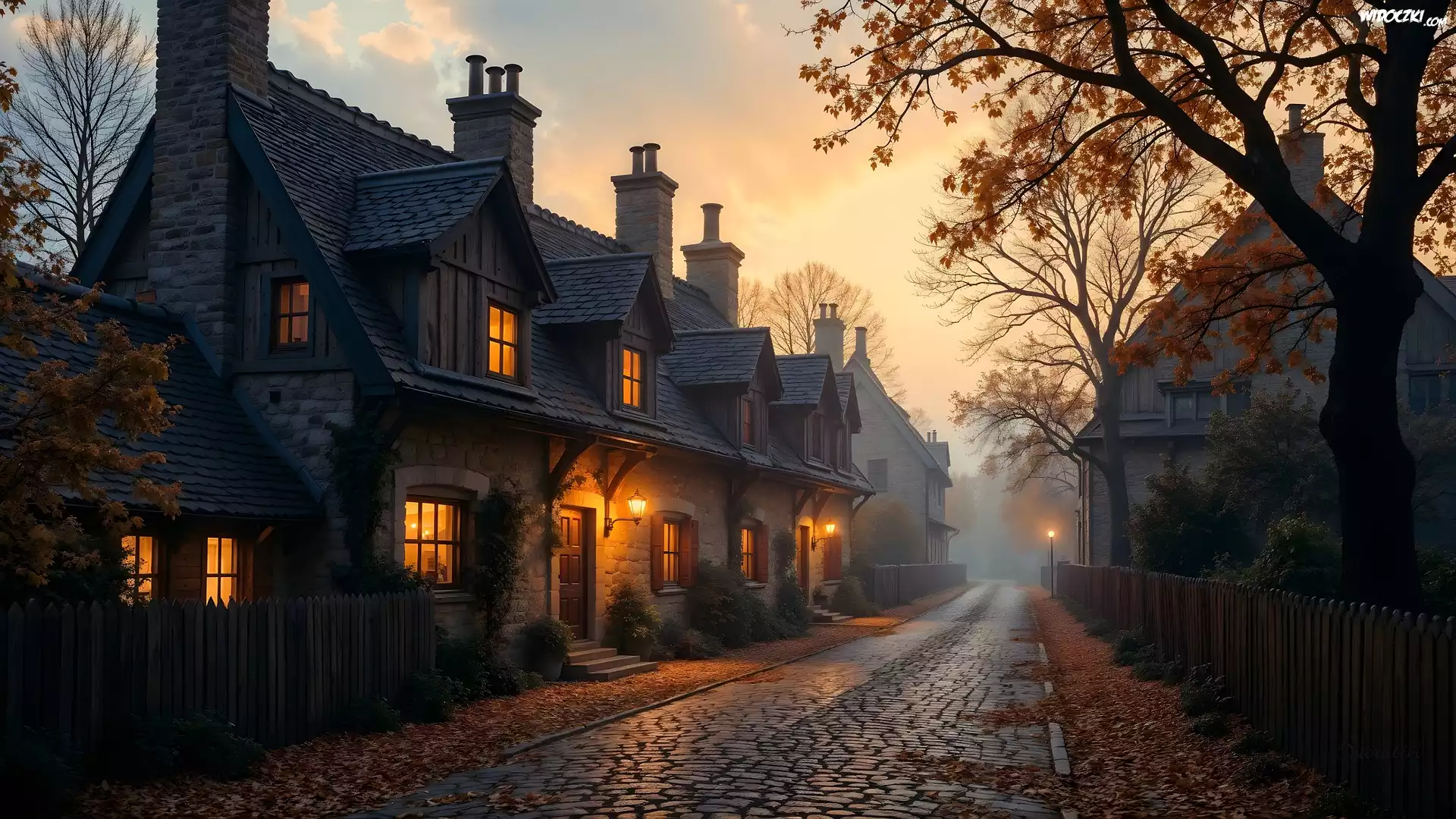 Zdjęcia, Droga, Domy, Mgła, Jesień, Grafika AI