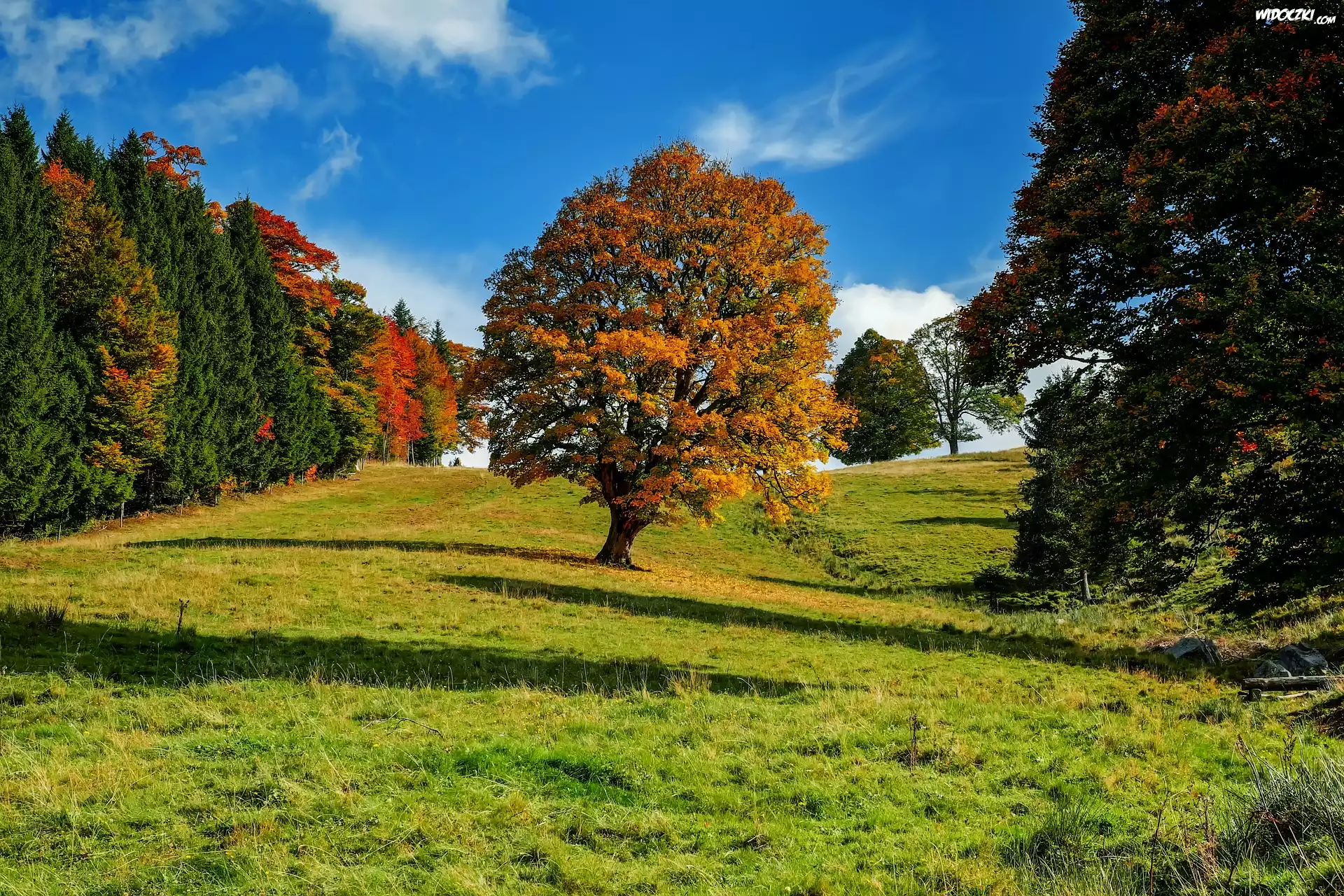 Zdjęcia, Jesień, Drzewa, Łąka, Niebo