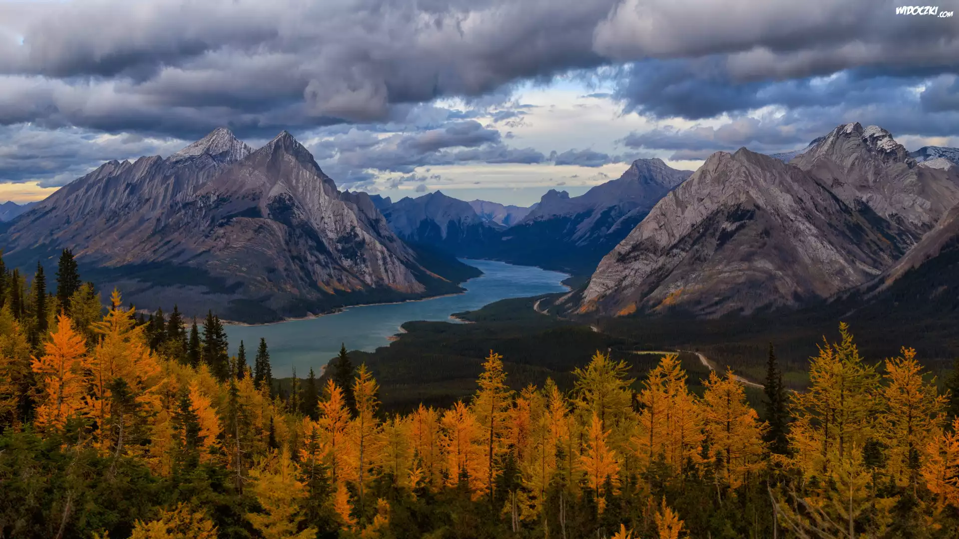 Zdjęcia, Jesień, Rzeka, Drzewa, Góry Skaliste, Chmury, Skały, Kananaskis, Alberta, Kanada