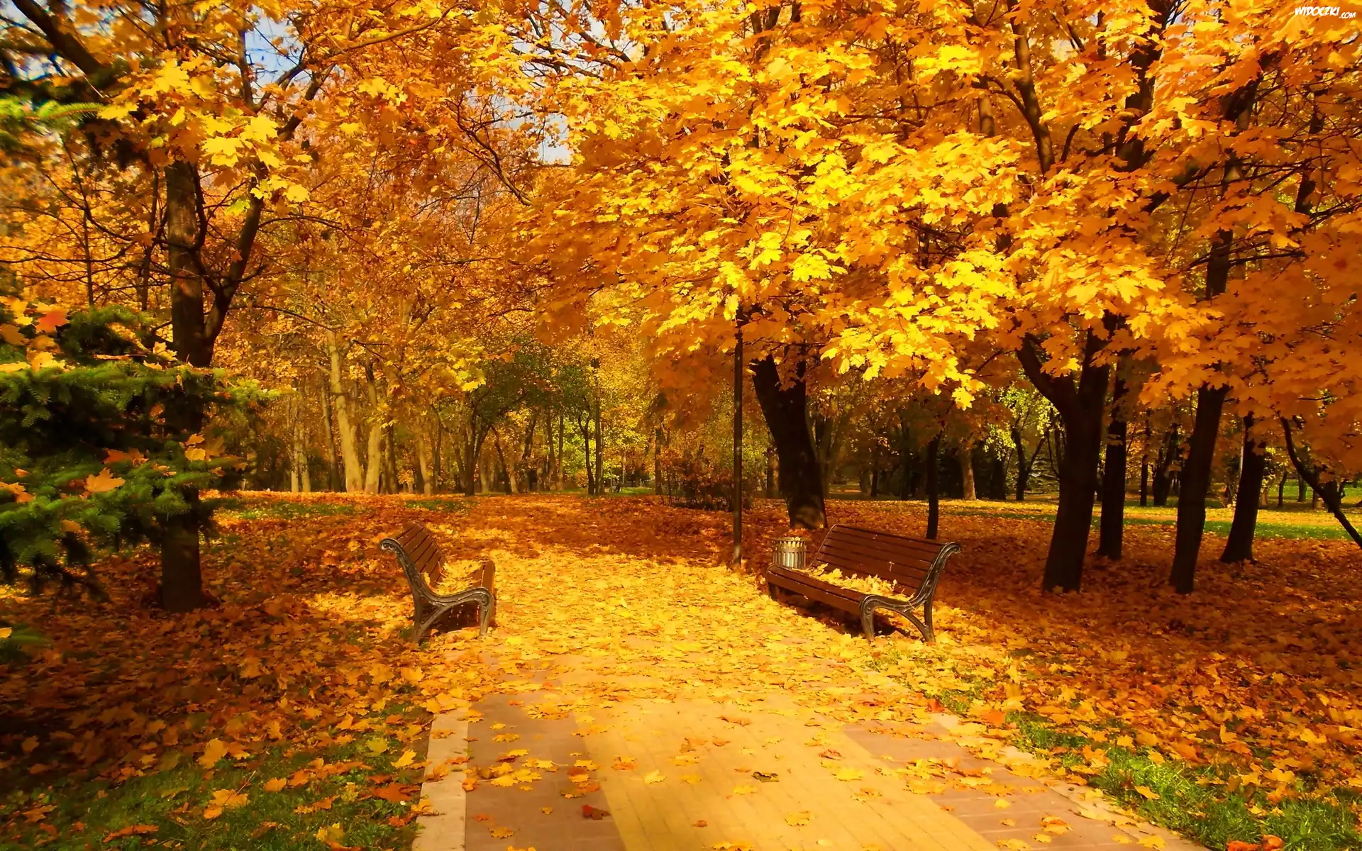 Zdjęcia, Park, Ławeczki, Alejki, Dywan, Z, Liści, Piękna, Złota, Jesień