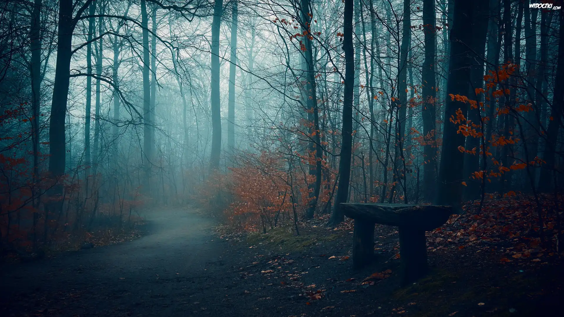 Jesień, Drzewa, Droga, Ławka, Mgła