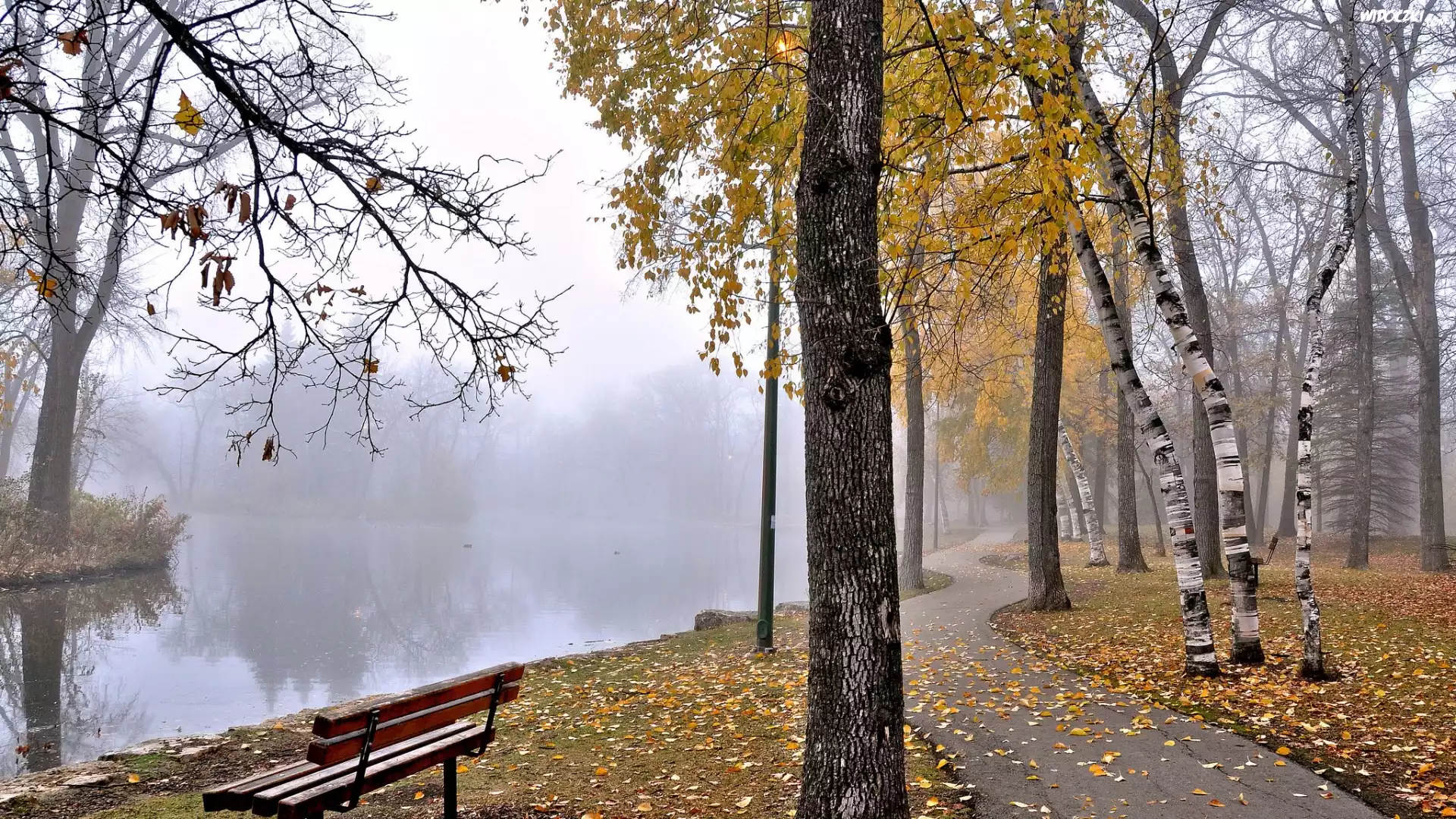 Zdjęcia, Jesień, Park, Drzewa, Mgła, Ławka, Staw