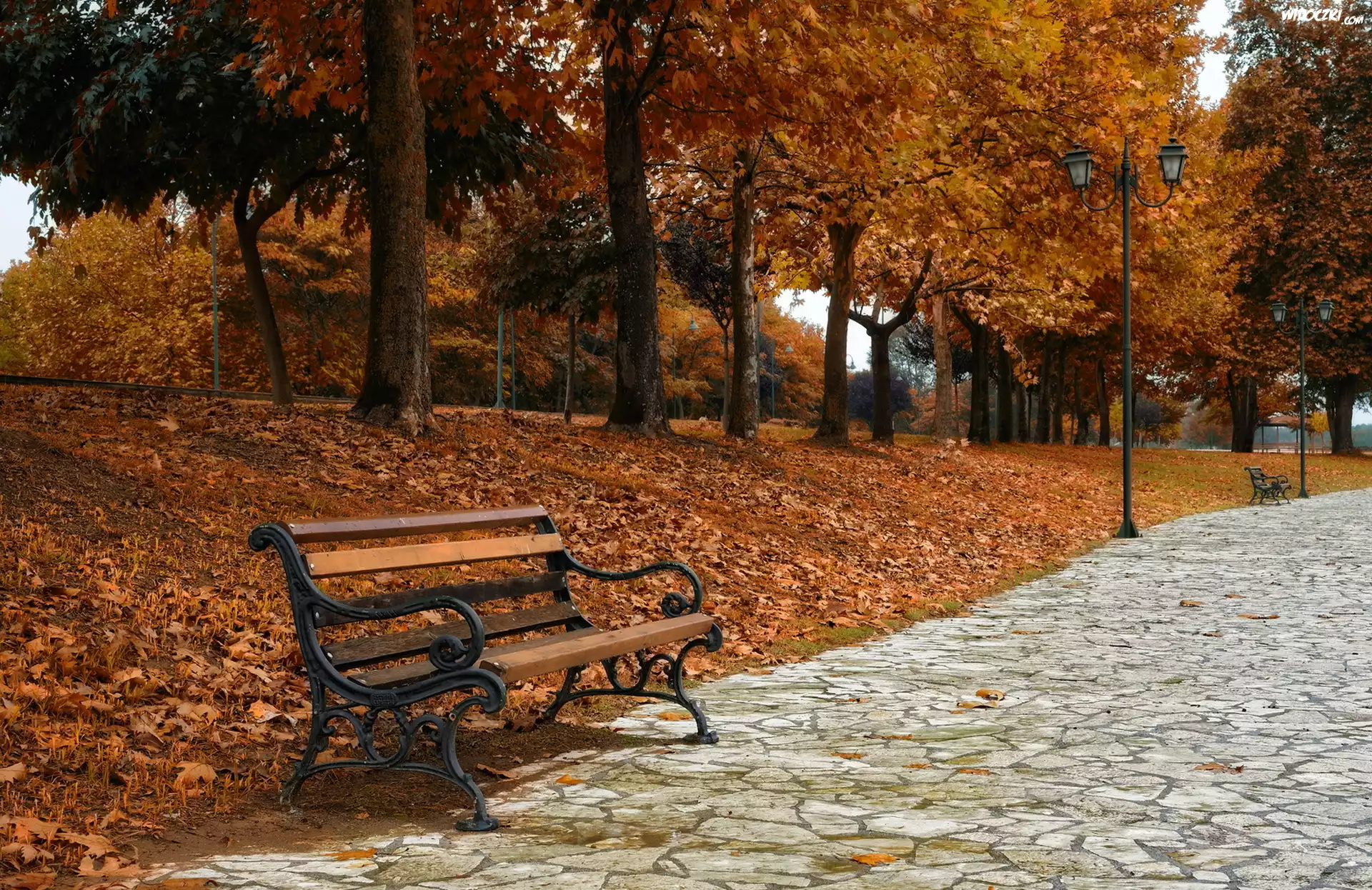 Zdjęcia, Jesień, Park, Ławka, Aleja