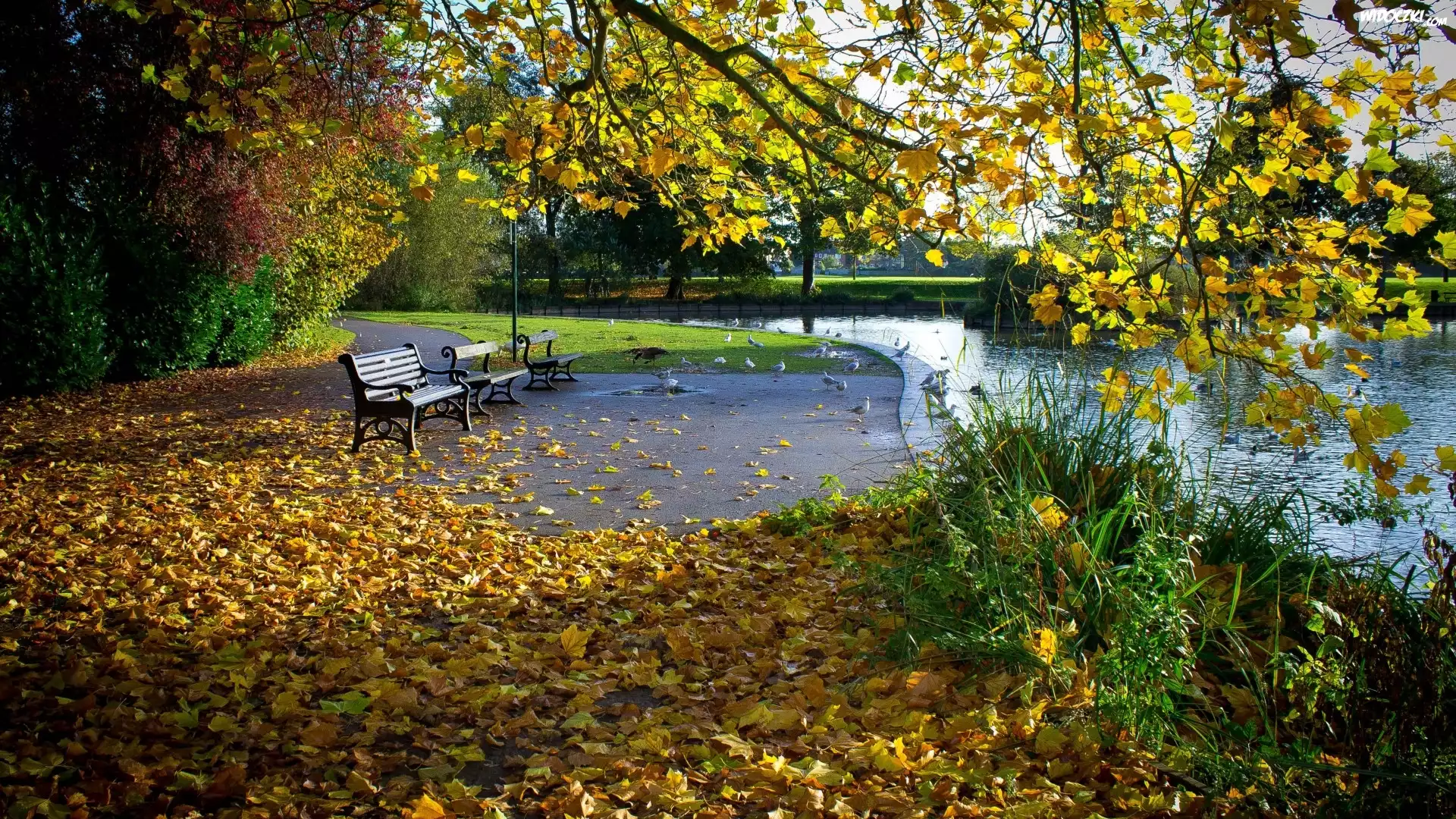 Zdjęcia, Jesień, Park, Staw, Ławka, Liście