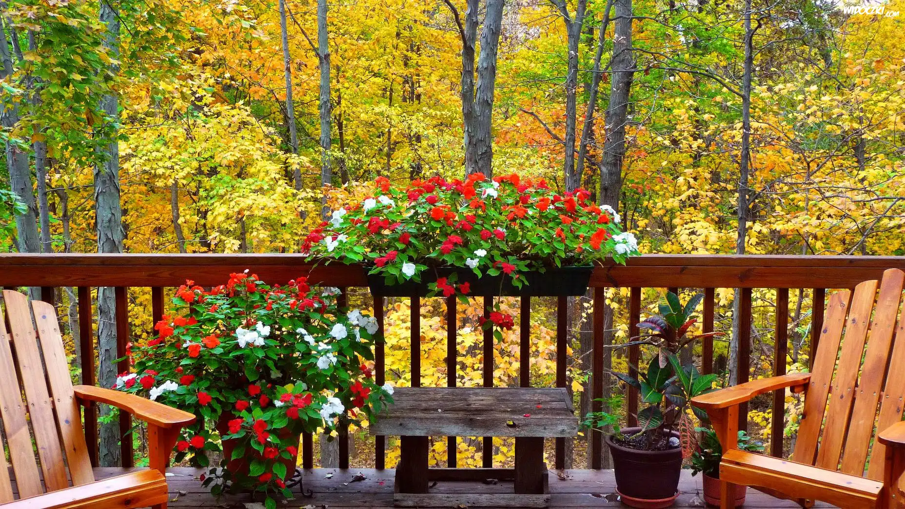 Zdjęcia, Jesień, Las, Balkon, Kwiaty