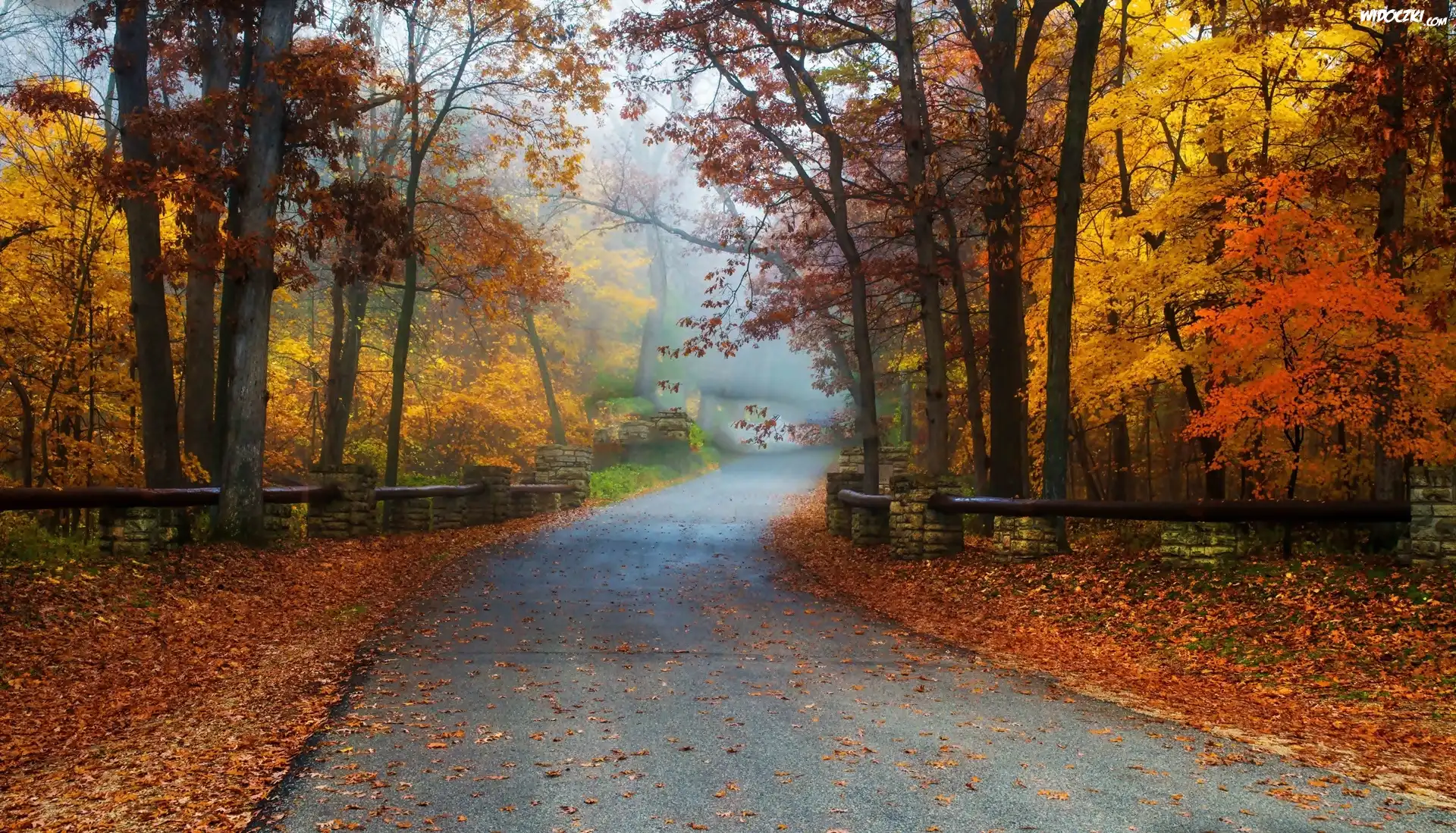 Zdjęcia, Jesień, Droga, Mgła Las, Barierki, Liście