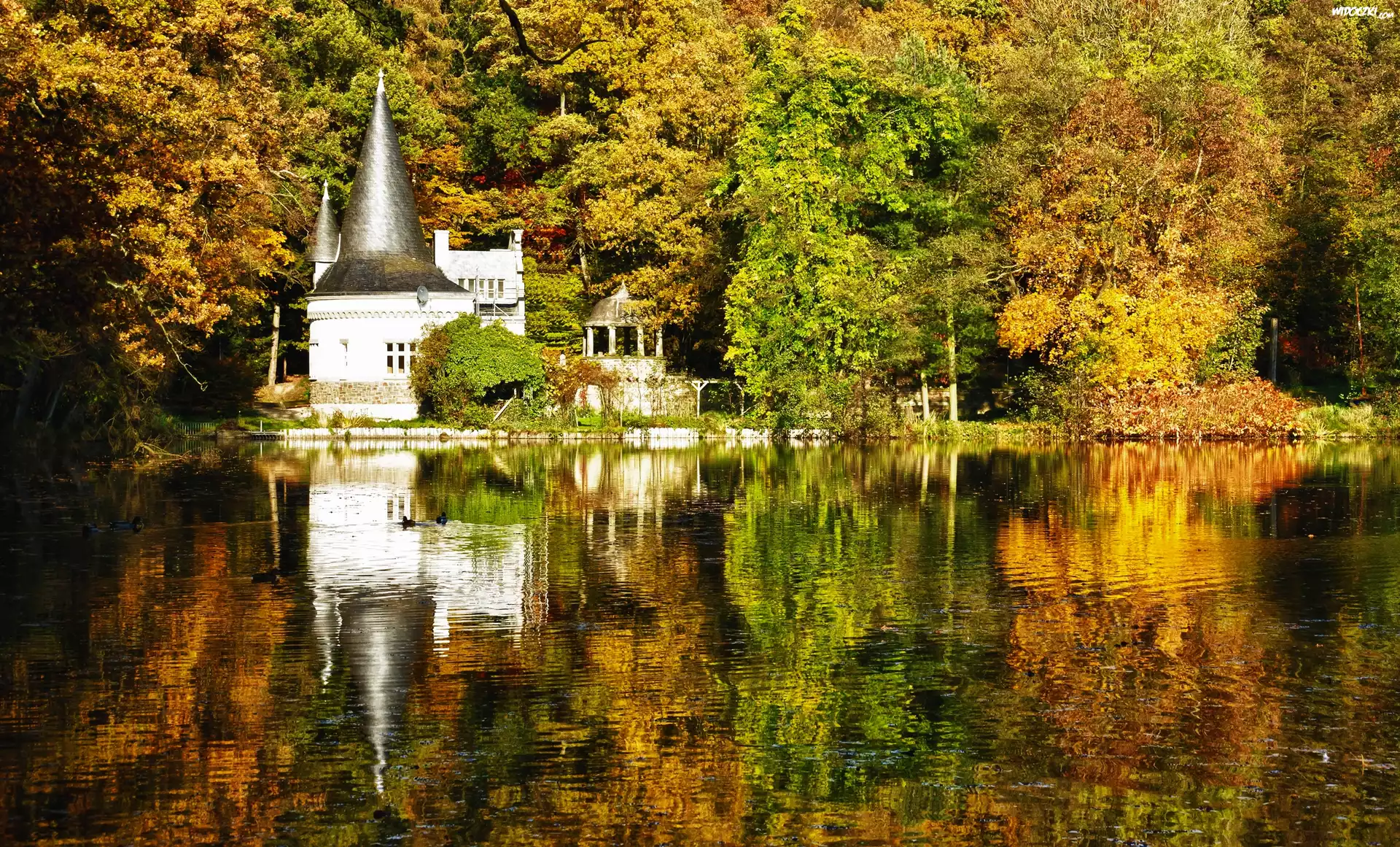 Zdjęcia, Jesień, Las, Jezioro, Biała, Budowla