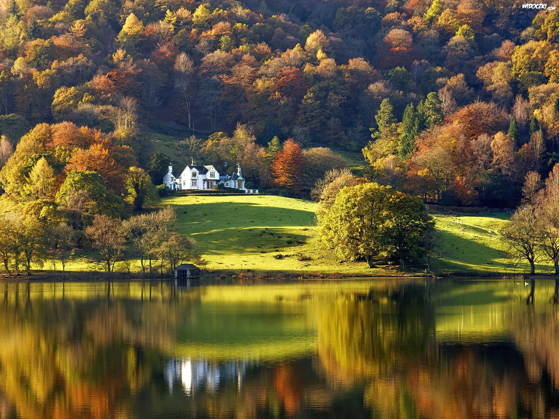 Zdjęcia, Jesień, Drzewa, Jezioro, Biały, Domek