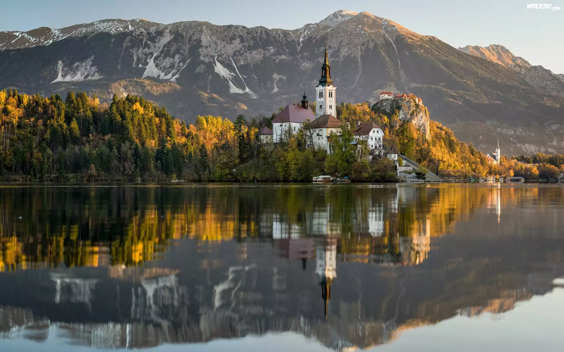Jesień, Góry, Jezioro Bled, Wyspa, Kościół Wniebowzięcia Najświętszej Marii Panny, Odbicie, Drzewa, Słowenia |