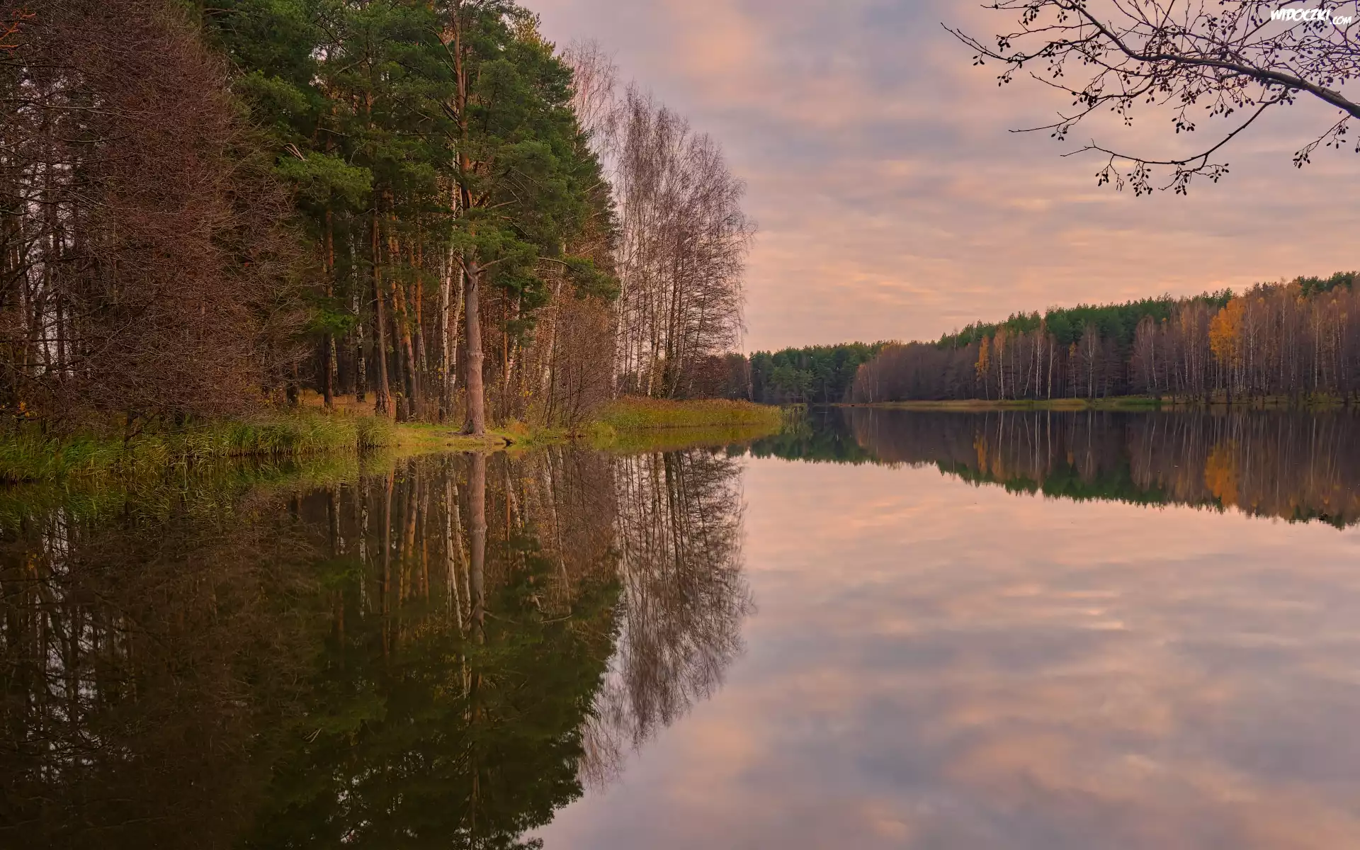Jesień, Jezioro, Las, Drzewa, Brzozy, Odbicie