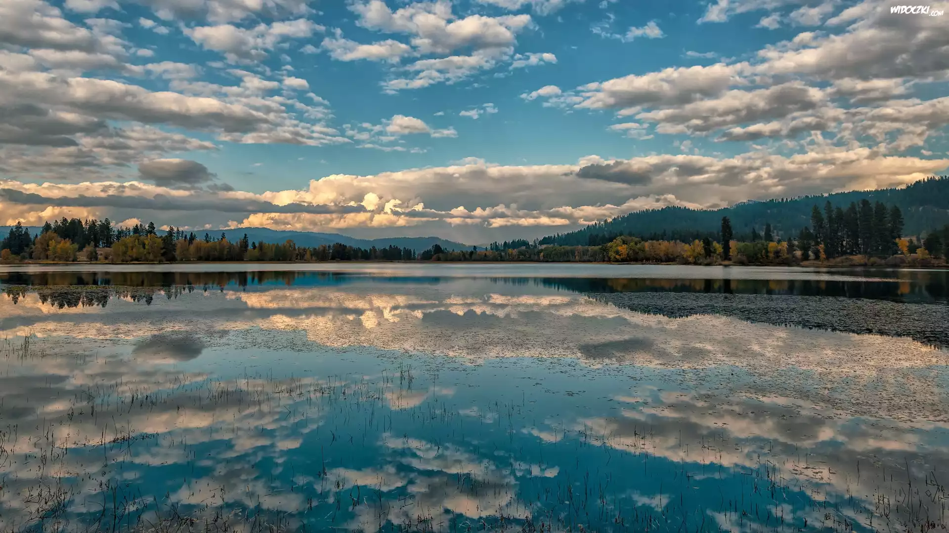 Jesień, Jezioro, Góry, Drzewa, Chmury, Odbicie