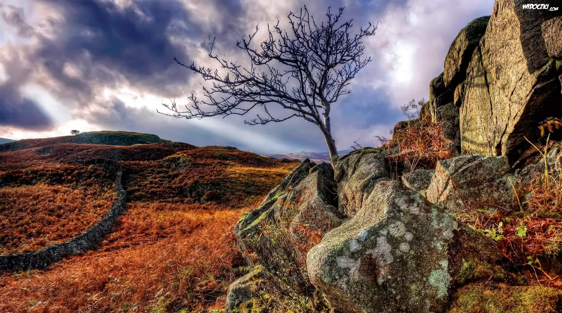 Zdjęcia, Jesień, Kamienie, Murek, Skały, Chmury, Drzewo
