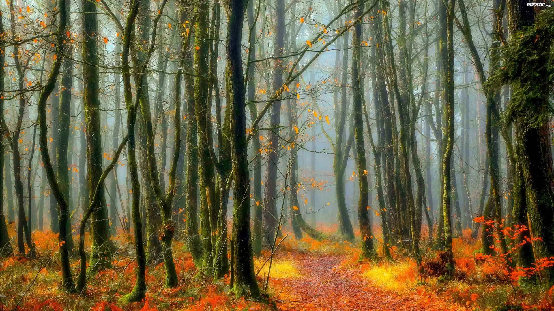 Jesień, Las, Drzewa, Ścieżka, Mgła