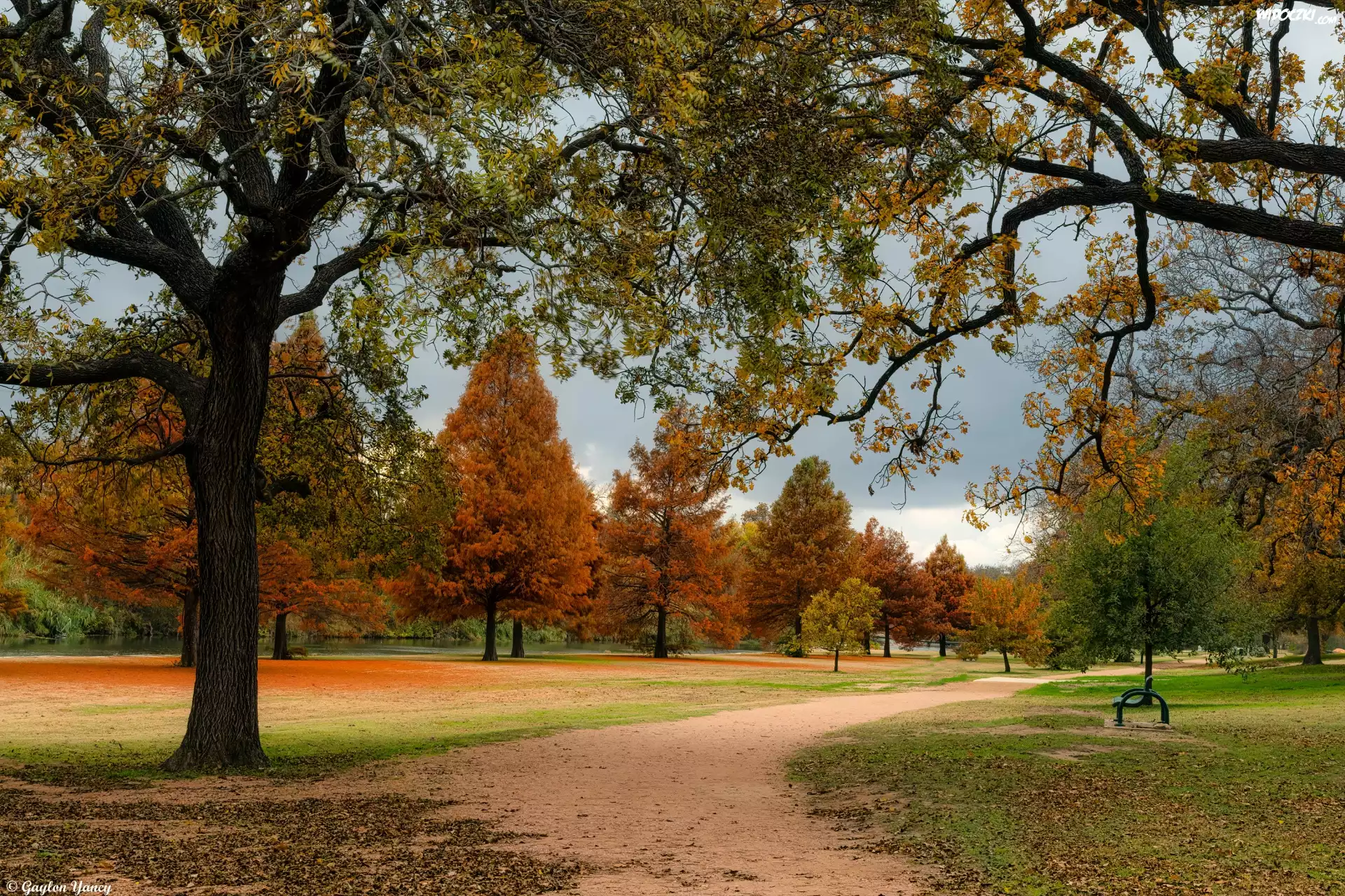 Zdjęcia, Jesień, Drzewa, Park, Ścieżka, Ławka
