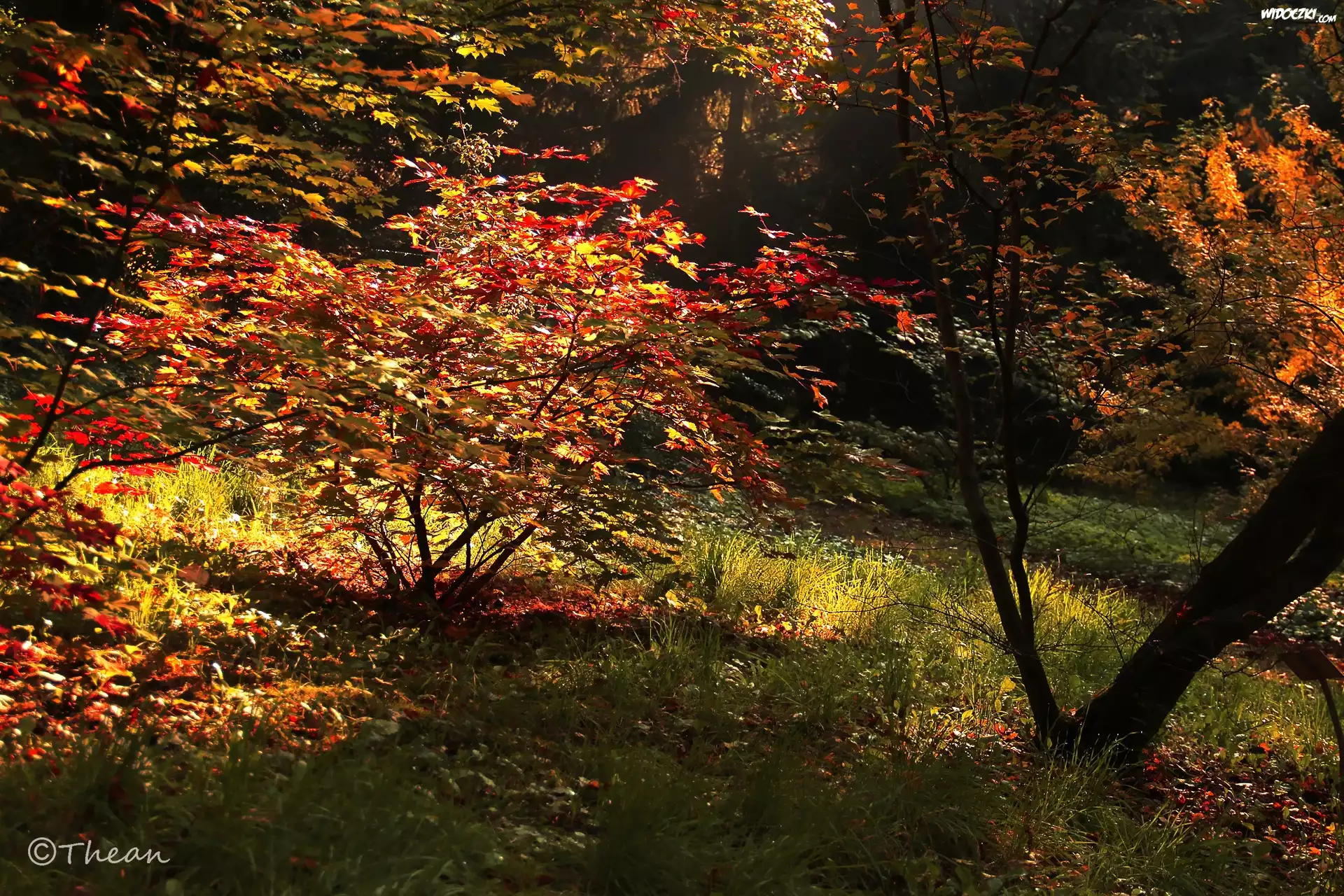 Zdjęcia, Jesień, Drzewa, Trawa, Kolorowe, Czerwone, Liście
