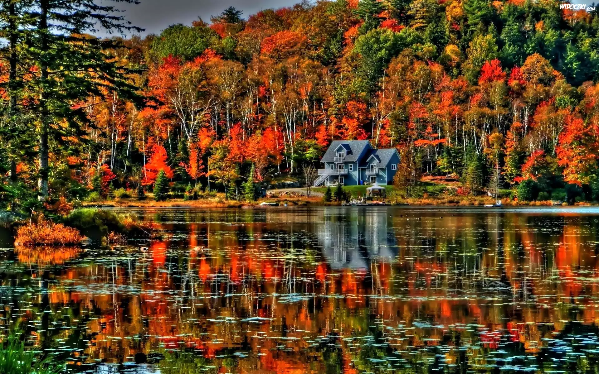 Jesień, Drzewa, Jezioro, Dom, Odbicie