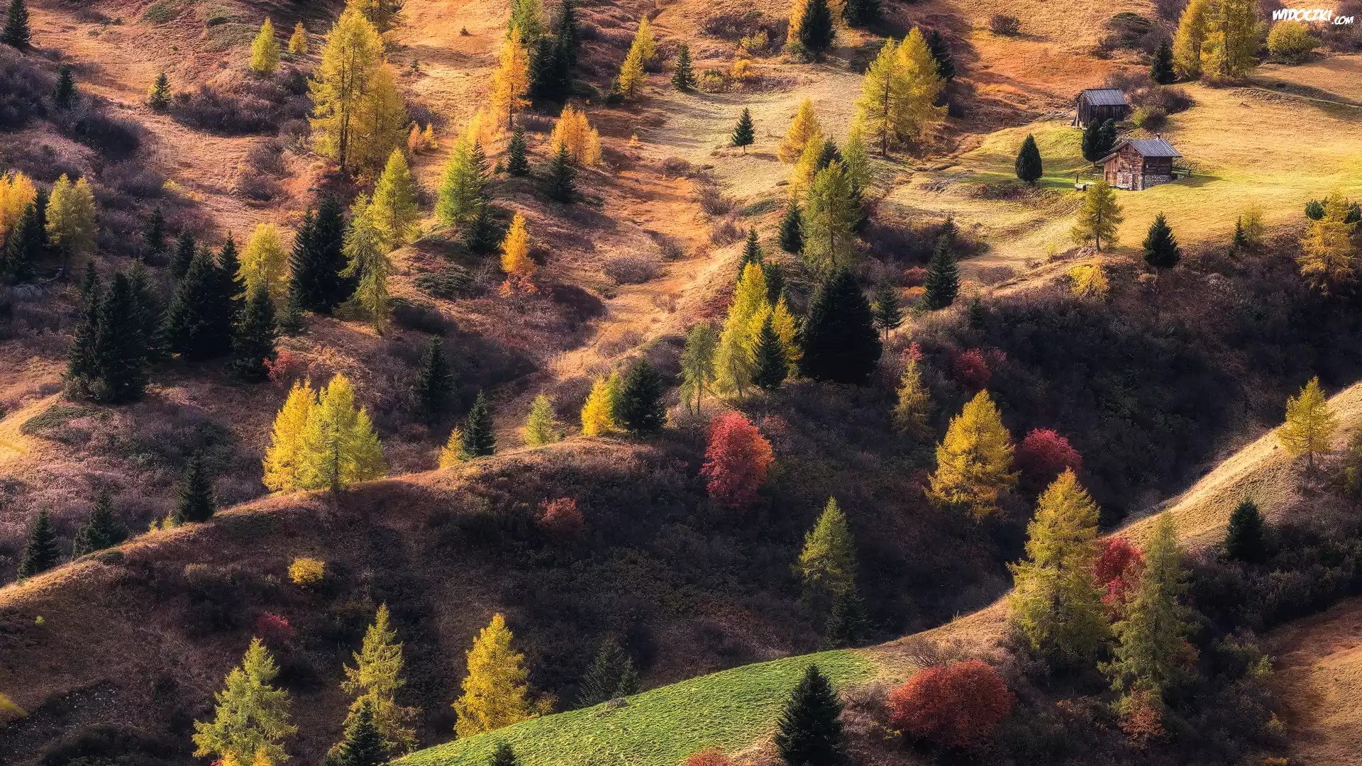 Zdjęcia, Jesień, Kolorowe, Drzewa, Domki, Pagórki