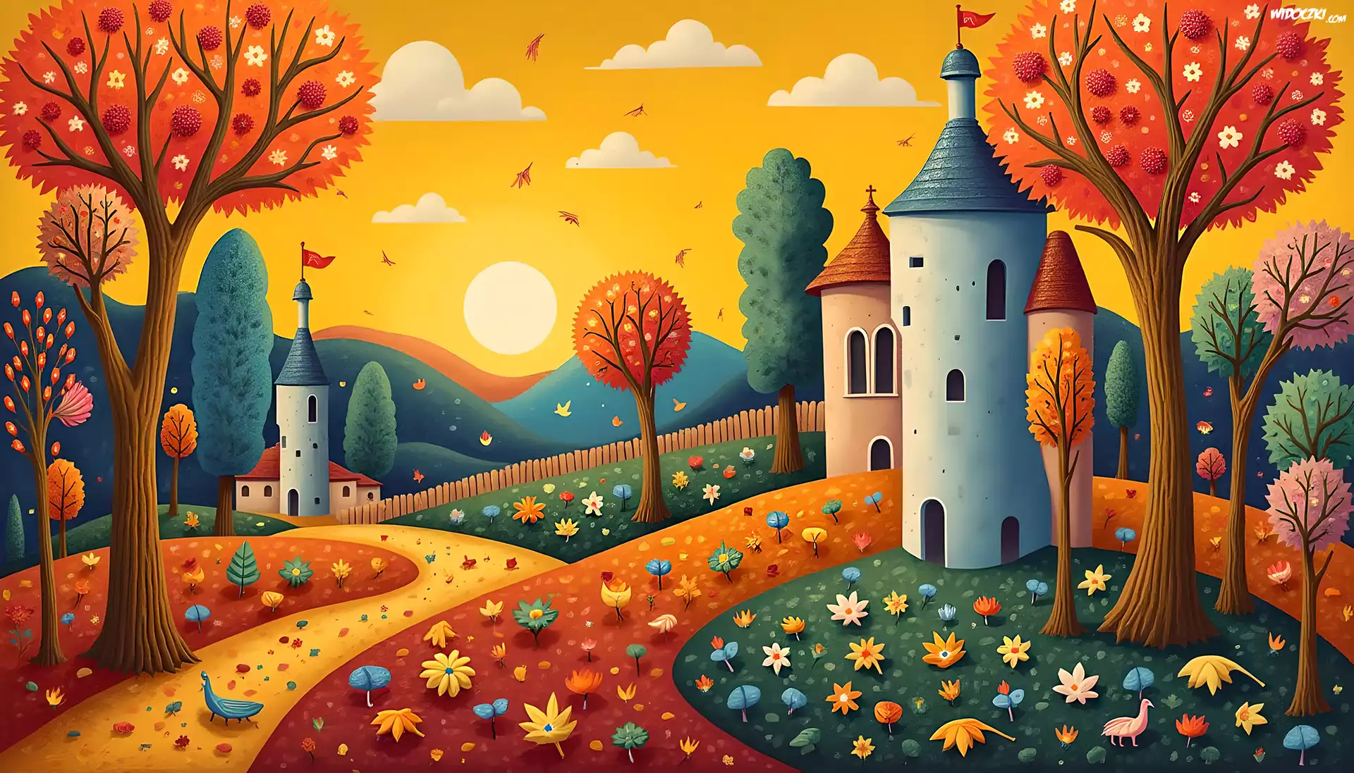 Kolorowa, Jesień, Domy, Drzewa, Grafika