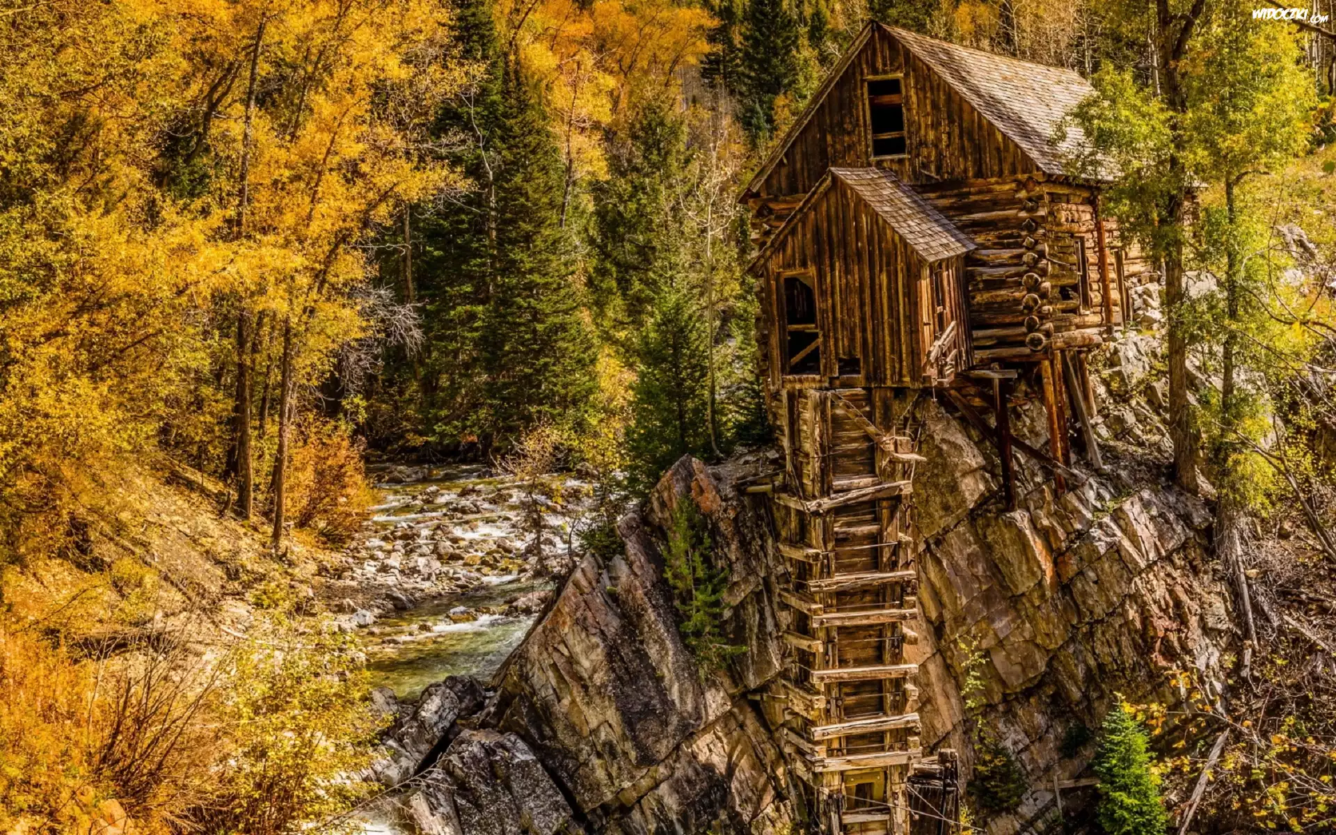 Zdjęcia, Jesień, Las, Drzewa, Skały, Drewniany, Dom