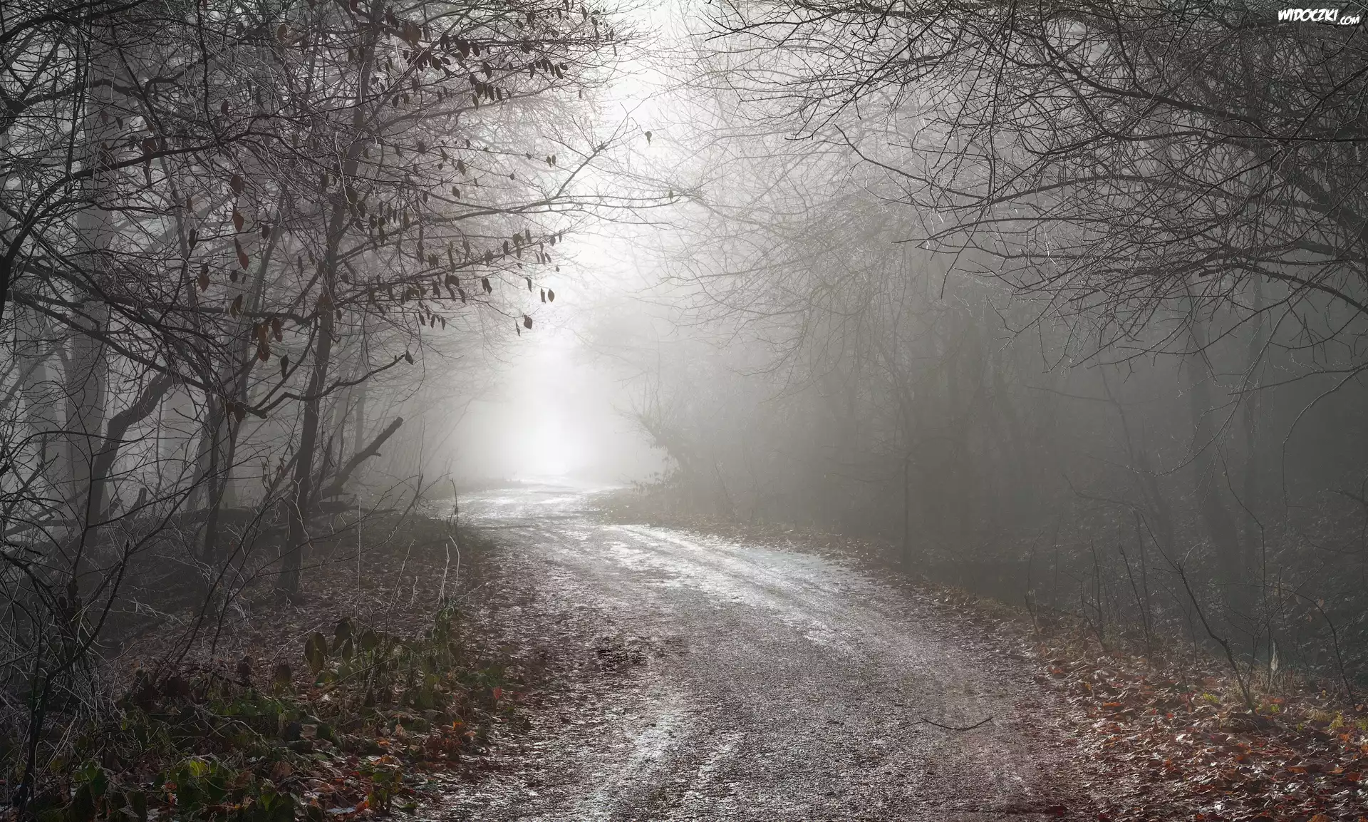 Zdjęcia, Jesień, Las, Drzewa, Droga, Mgła