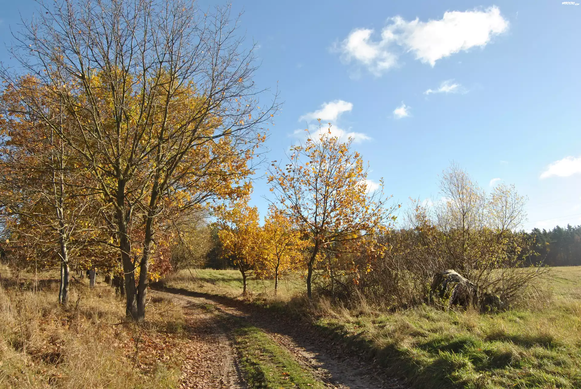 Jesień, Drzewa, Droga, Niebo