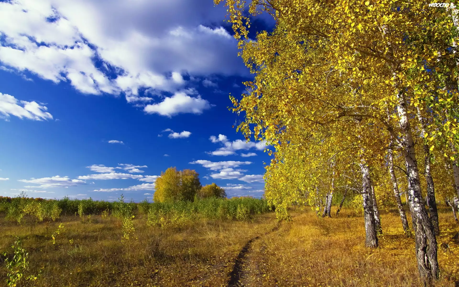 Zdjęcia, Jesień, Brzozy, Dróżka, Chmury