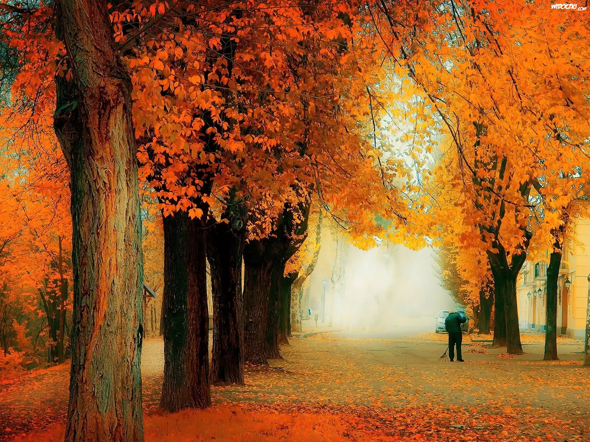 Jesień, Ulica, Alejka, Drzewa, Dozorca