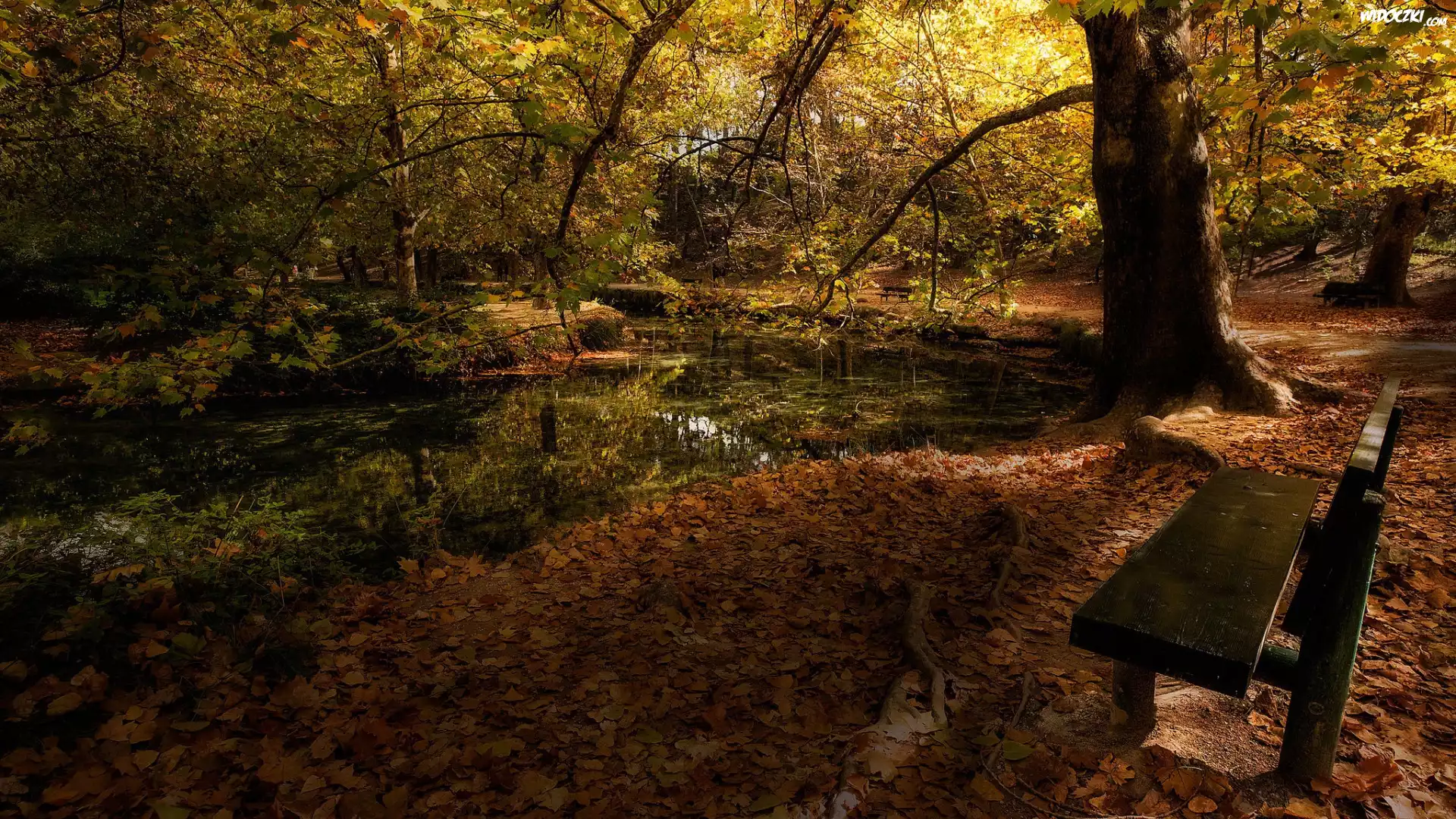 Zdjęcia, Jesień, Park, Ławka, Drzewa, Staw
