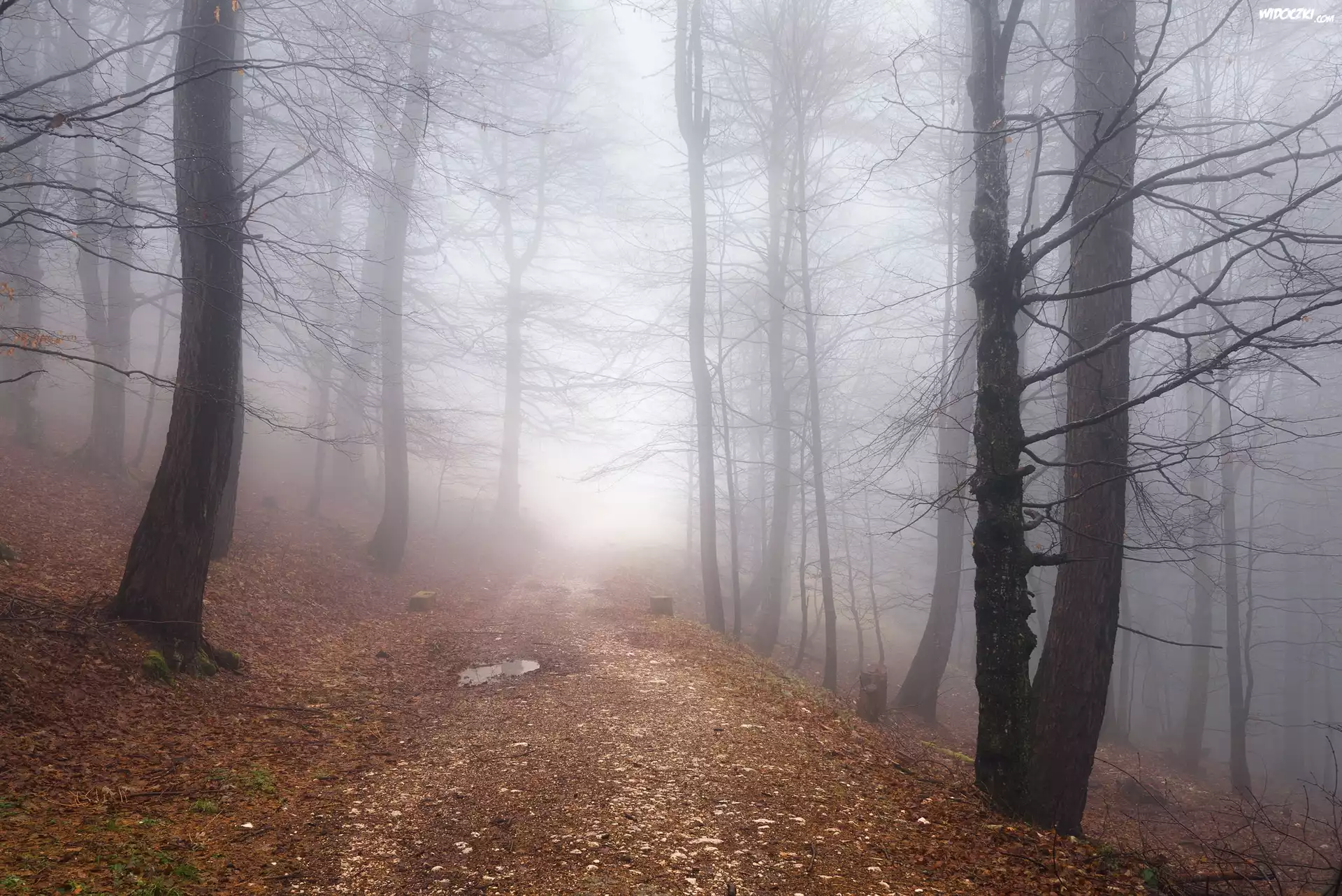 Zdjęcia, Jesień, Las, Bezlistne, Drzewa, Mgła